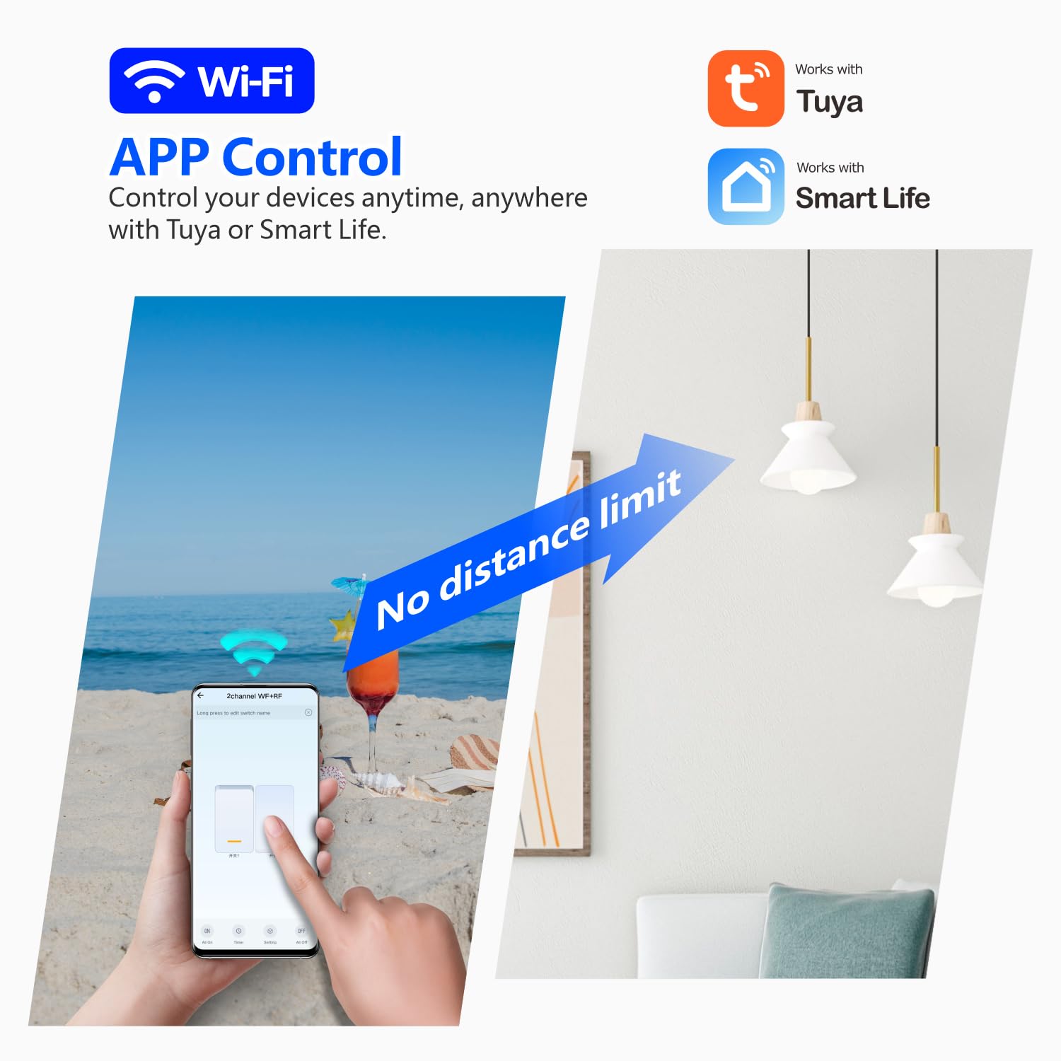 【APP Control】 This WiFi switch is compatible with the “Tuya” app and the “Smart Life” app, which are popular and widely used on the market. Connect this smart switch directly to your Wi-Fi network to enable unlimited wireless control via your phone (Android and iOS). In addition, the smart switch is compatible with Amazon Alexa (Amazon Echo/Dot/Spot) and Google Home. It is capable of achieving various types of smart controls.