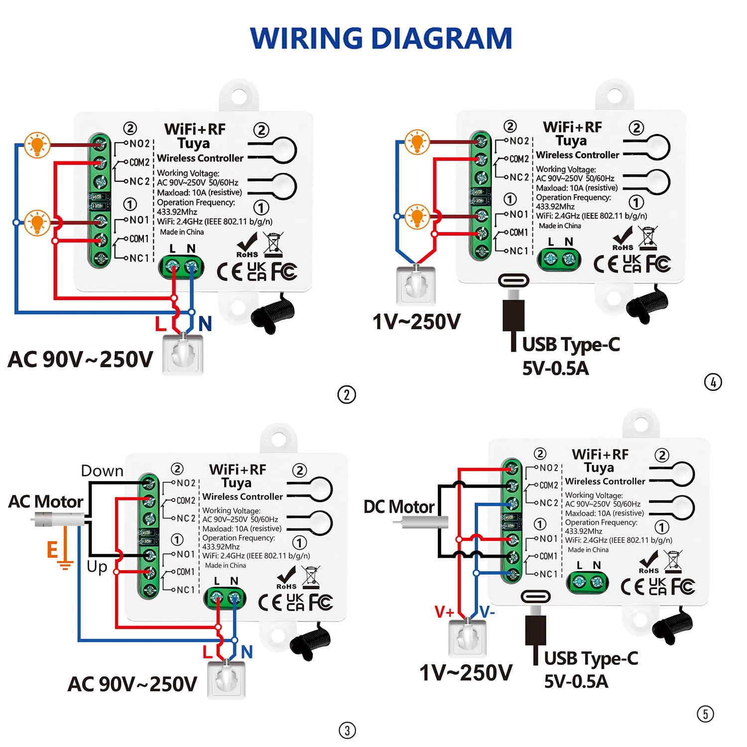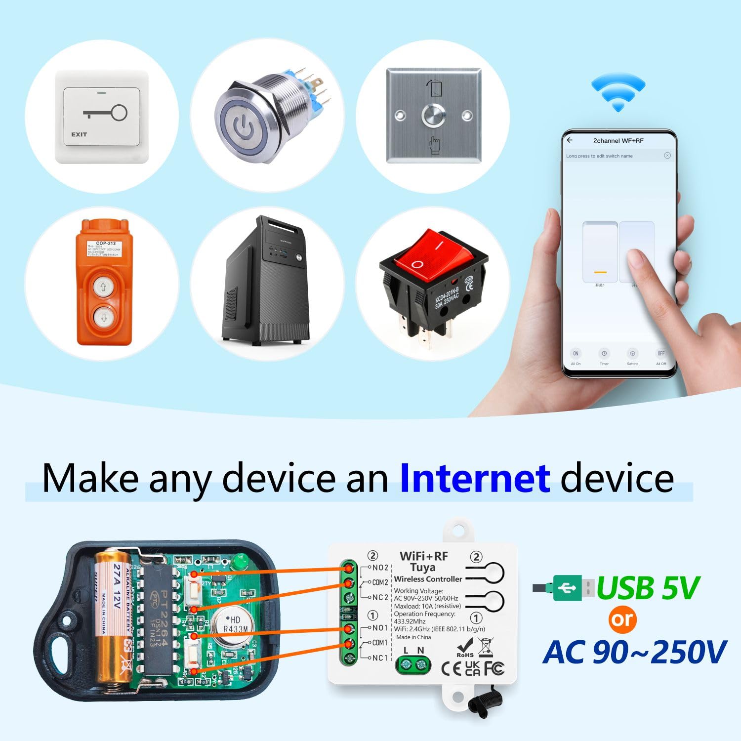 【Excellent Design】 Wireless WIFI + RF Smart Switch Relay Module. Stable and reliable performance with high reception sensitivity (2.4 GHz WLAN). You can remotely control any machine connected to the relay receiver via the Internet from anywhere in the world. And it is compatible with the RF 433 MHz radio remote control.