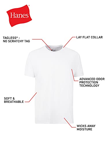 Description Whether you wear this classic crewneck t-shirt as an undershirt or a tee, you'll appreciate how Hanes® has taken a basic style and made it even better. You'll love the lay-flat crewneck collar, tag-free design, and extra-long length that ensures they stay tucked in. Made with advanced odor protection technology and Cool Comfort® moisture-wicking fabric, you’ll stay cool and feel fresh no matter how long your day is. Stock up on these comfortable men's tees in a convenient 6-pack of assorted colors and start wearing a better-than-basic undershirt.