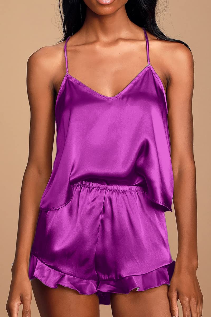The cute satin silk cami pajamas tops features v neck,low cut,racerback,adjustable straps,the shorts features high waisted,elastic waist,casual loose style.The cute and sexy pajamas sets will make you look more flattering,elegant for your sweet night.