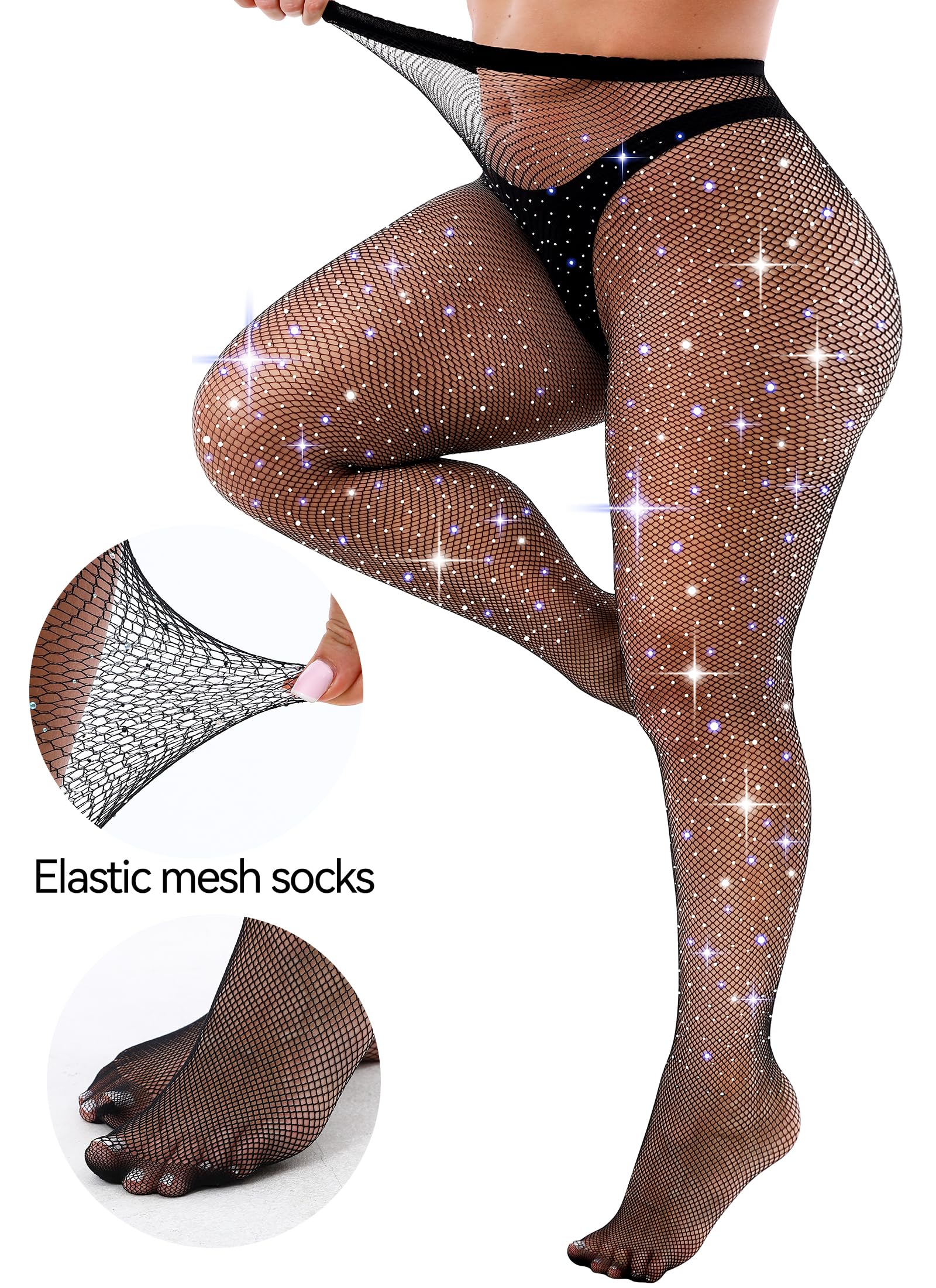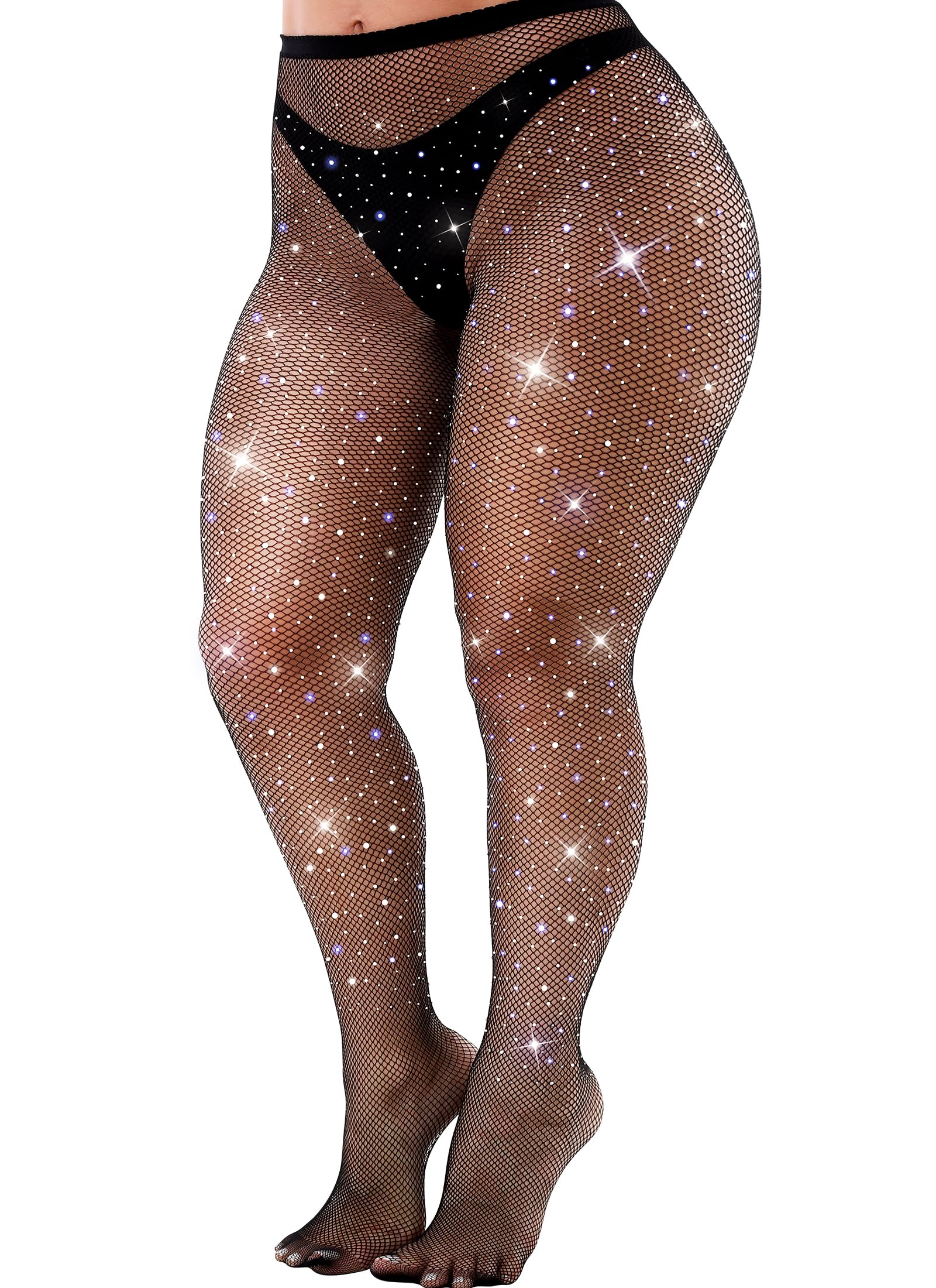 3XL Plus Size Sparkle Fishnet Stockings, Sparkle Rhinestone, Classic Fishnet style, High waist stockings,waistband, glitter net tights, fishnet gives a geometric effect on legs.