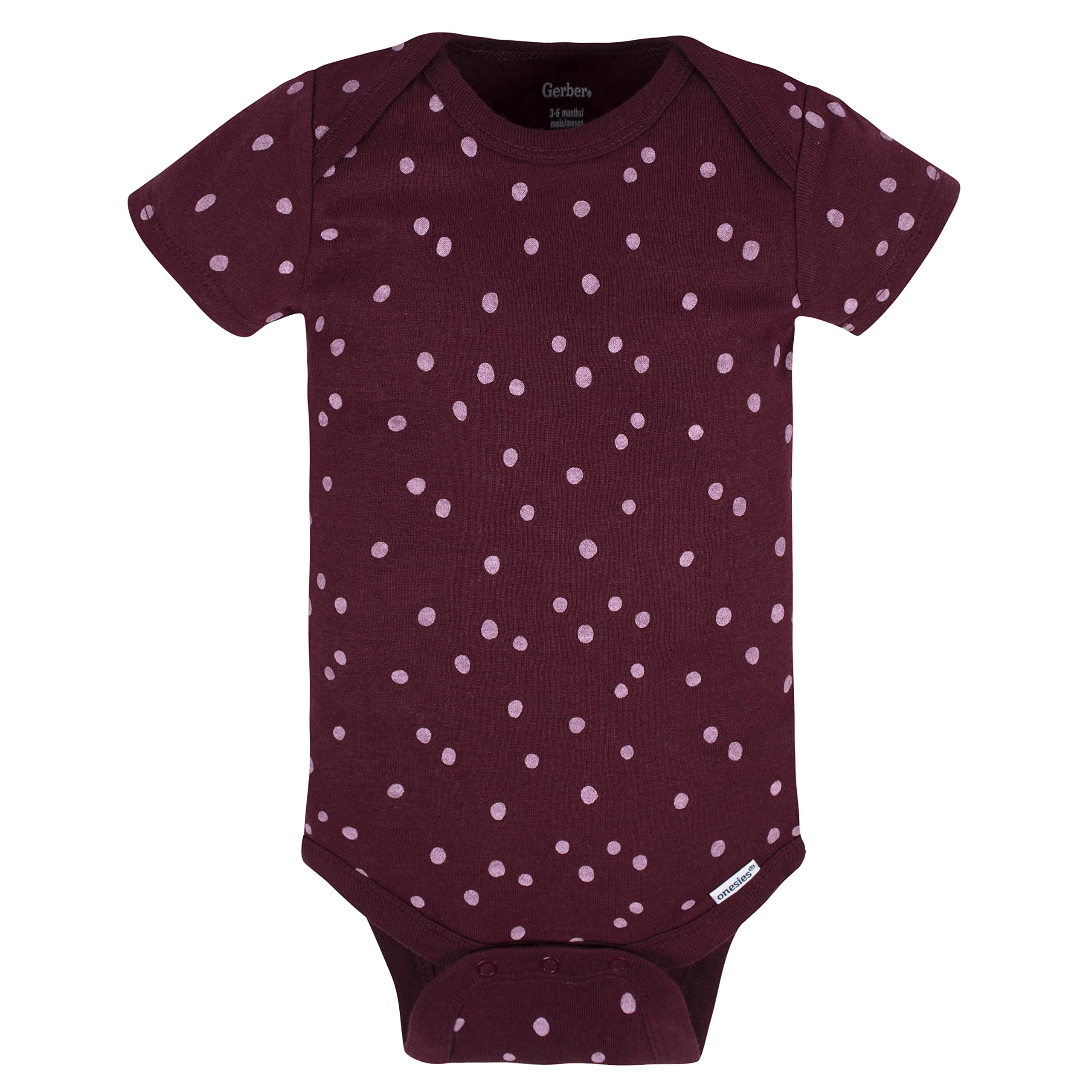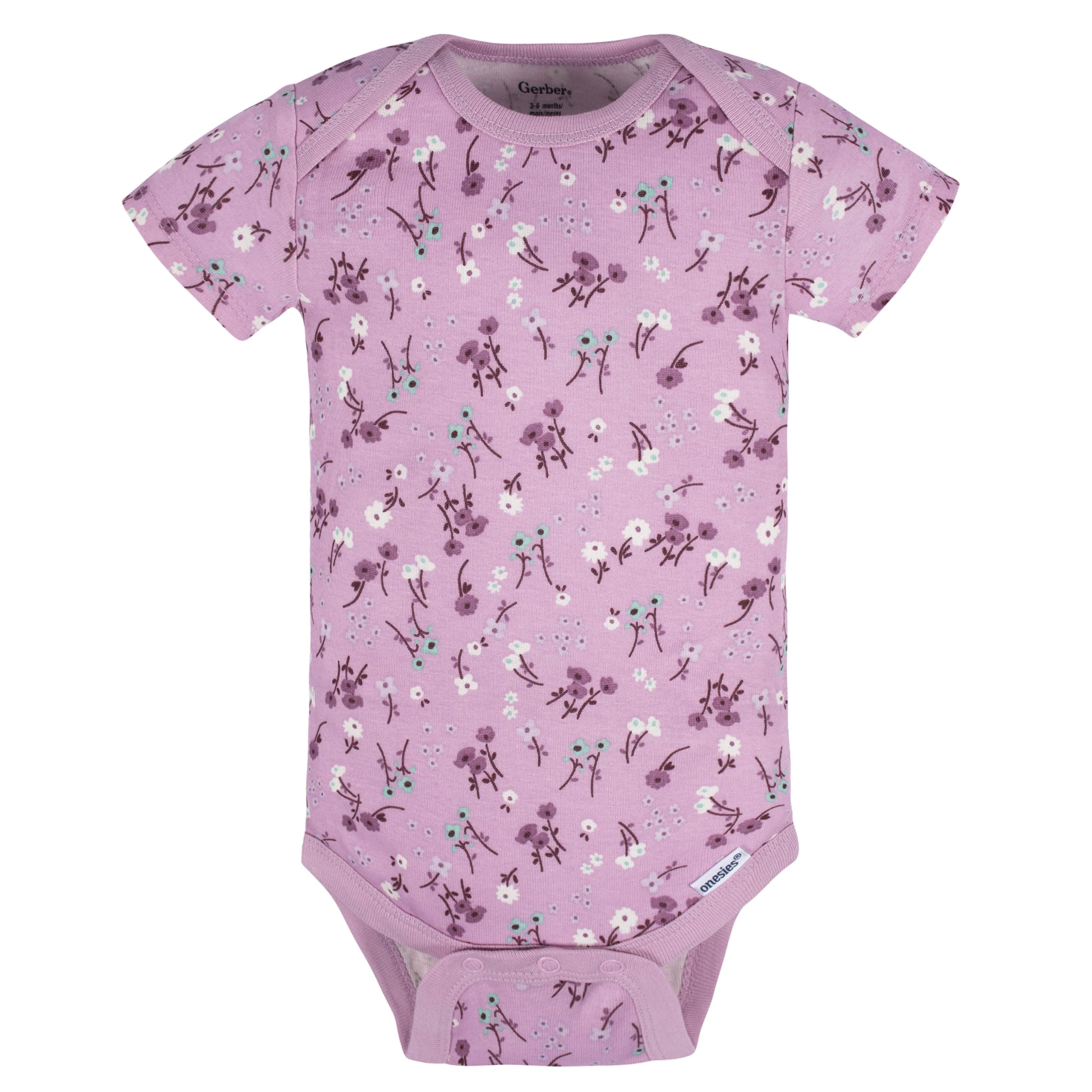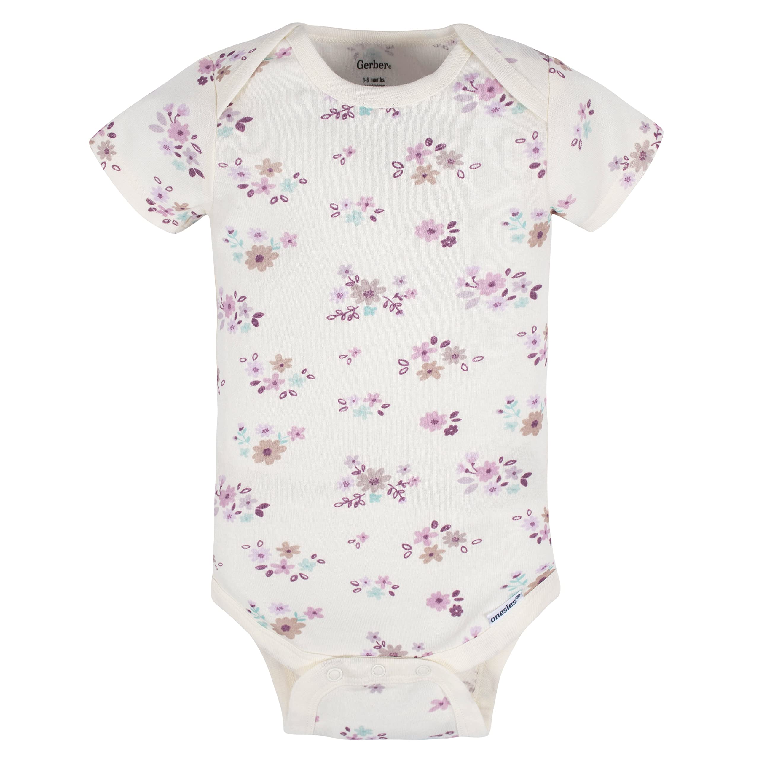 Description Your little girl will start the day looking her best dressed in one of these Gerber Onesies brand short sleeve bodysuits! Moms and dads will appreciate the higher-in-the-front bottom nickel-free snaps closure that makes for fast and easy diaper changes. 100% cotton rib for breathability and comfort. Mix and match with your favorite bottoms to create a complete look. An essential item for new parents, great for gift giving.