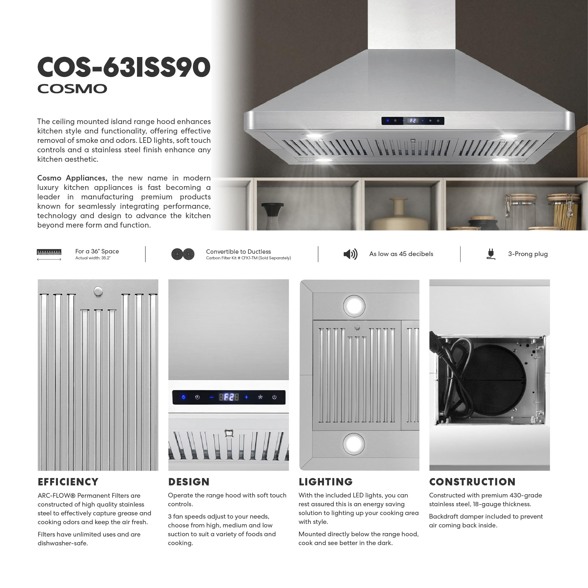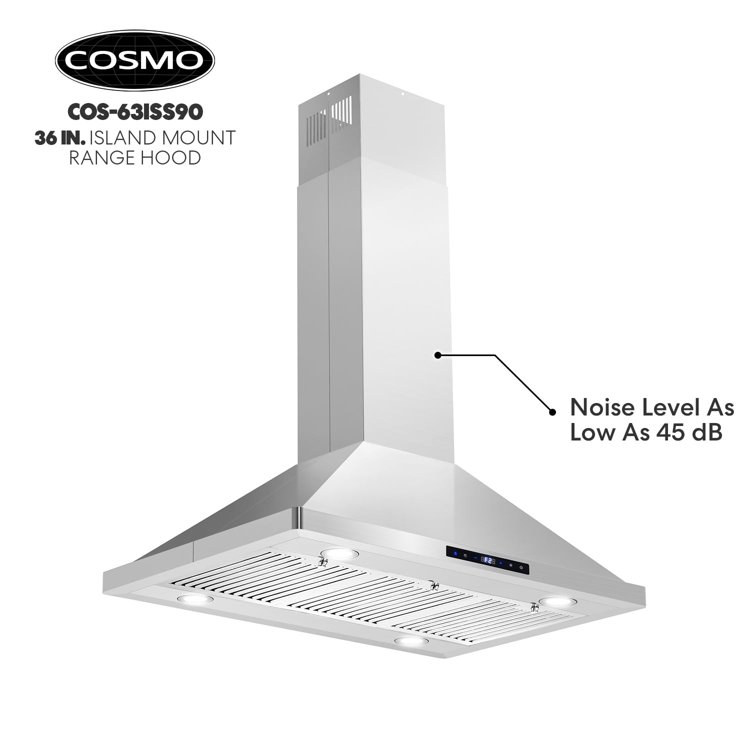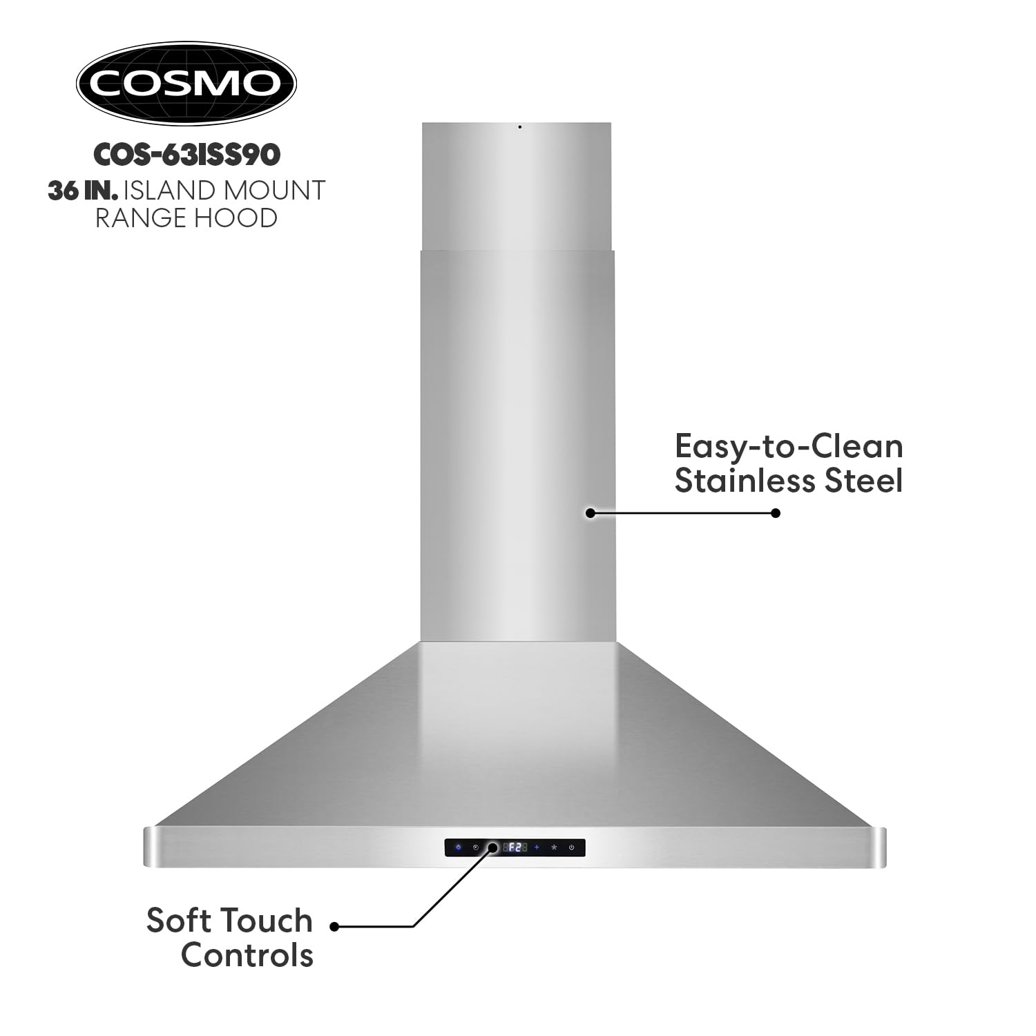Presenting the newest addition to the Cosmo line of stylish professional filtering systems. This 36 in. stainless steel Island Mount Range Hood is in a class of its own. Coveted by kitchen design experts for its sophistication and ultra-modern aesthetic that seamlessly complements a variety of kitchen designs. Its modern features include commercial grade 430 stainless steel and a 380 CFM centrifugal motor dedicated to ridding your house of lingering aromas. Dishwasher-safe premium stainless steel baffle filters to trap grease and oil. (4) 2-Watt LED lights to illuminate your cooktop below. Part of the Lumin Collection bringing enhanced functionality and design, offering a well-rounded option for those looking for more convenience and style in an appliance.