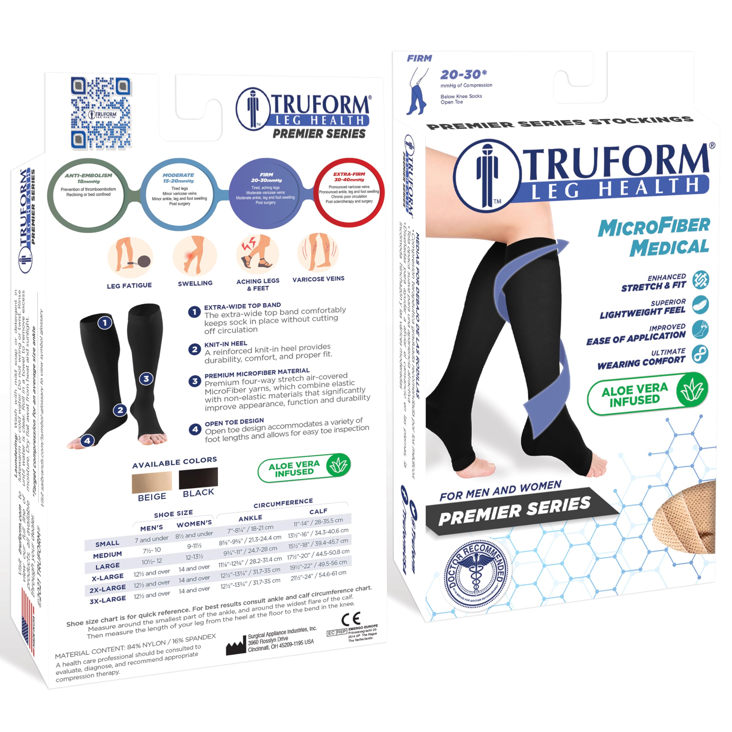 Product Description Truform Aloe Infused MicroFiber Medical Compression Socks utilize 20-30 mmHg graduated compression technology to help restore leg health. The added benefit of Aloe-Infusion actively replenishes and hydrates skin to repair and prevent scaling and cracking. Aloe promotes healing by increasing collagen in wounds and skin to help alleviate dry, itchy, and flaky symptoms. Designed with premium four-way stretch air-covered latex-free yarns to significantly improve comfort, durability, and easy on-off application. Not only are these easier to apply and remove, but the enhanced stretch and fit increases wearing comfort for a wider range of leg shape and sizes. Proudly made in the USA in our own FDA registered facility to maintain quality; Truform helps treat poor circulation and blood pooling which can lead to serious health risks including: swelling of the legs and feet, varicose veins, DVT, and blood clots. That's why for over 130 years Truform has been the trusted partner in leg health. Manufacturer Contact Information 3960 Rosslyn Dr, Cincinnati, OH 45209
