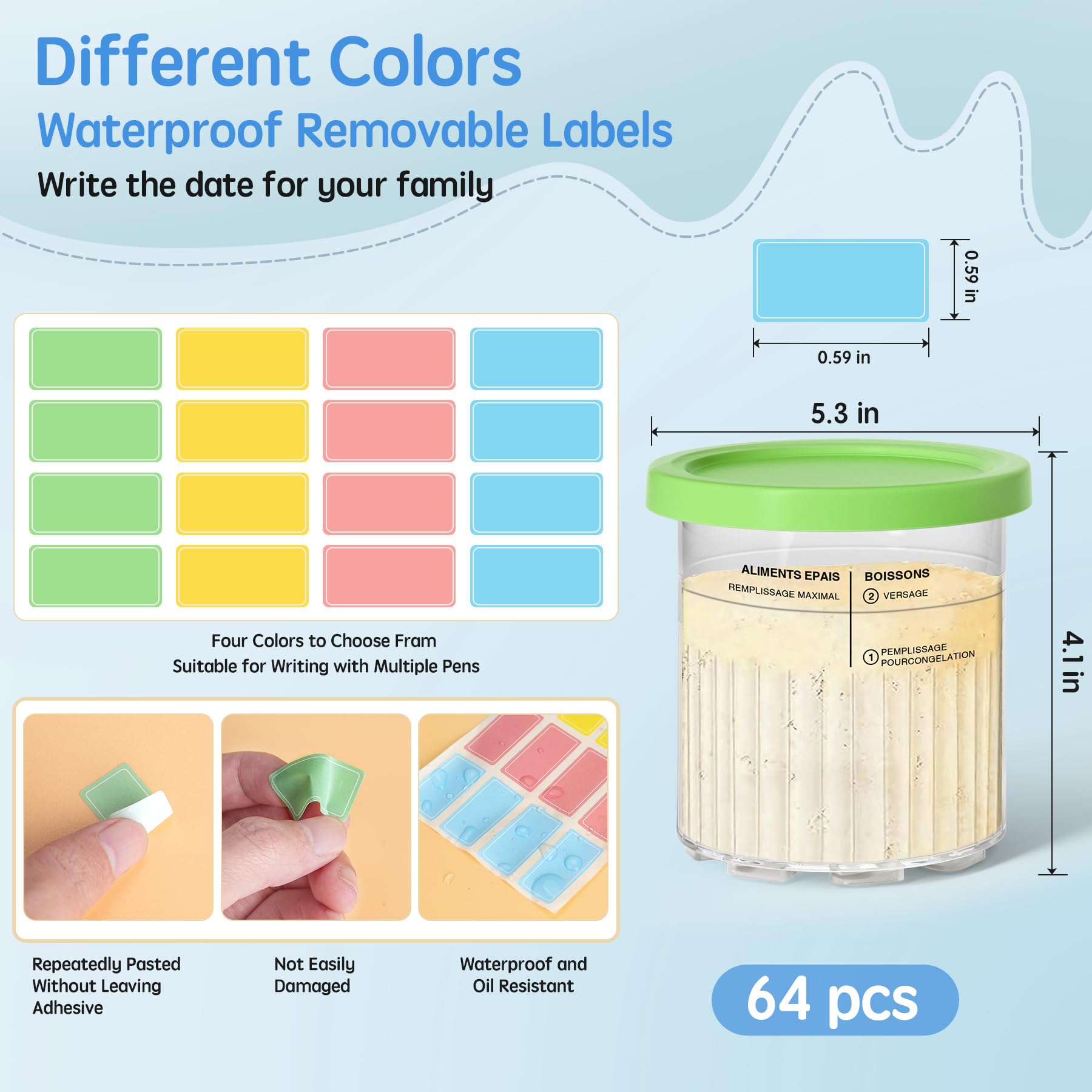 COMPLETE MATCHING SET: This set comes with 4 pints, 4 lids, 4 spoons, and 1 metal scoop, 64pcs assorted colors waterproof removable labels can be writen flavor names/dates with pen and remove residue-free - ideal for allergy warnings or recipe experiments. Labels withstand freezer condensation without smudging.