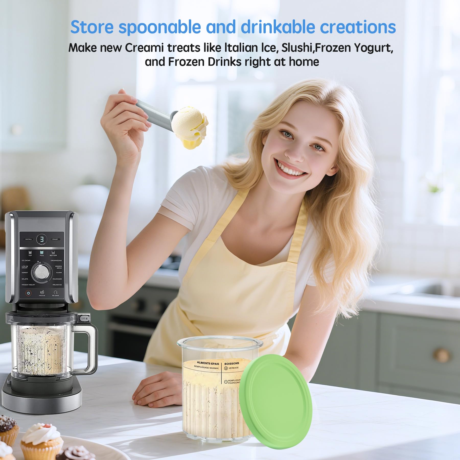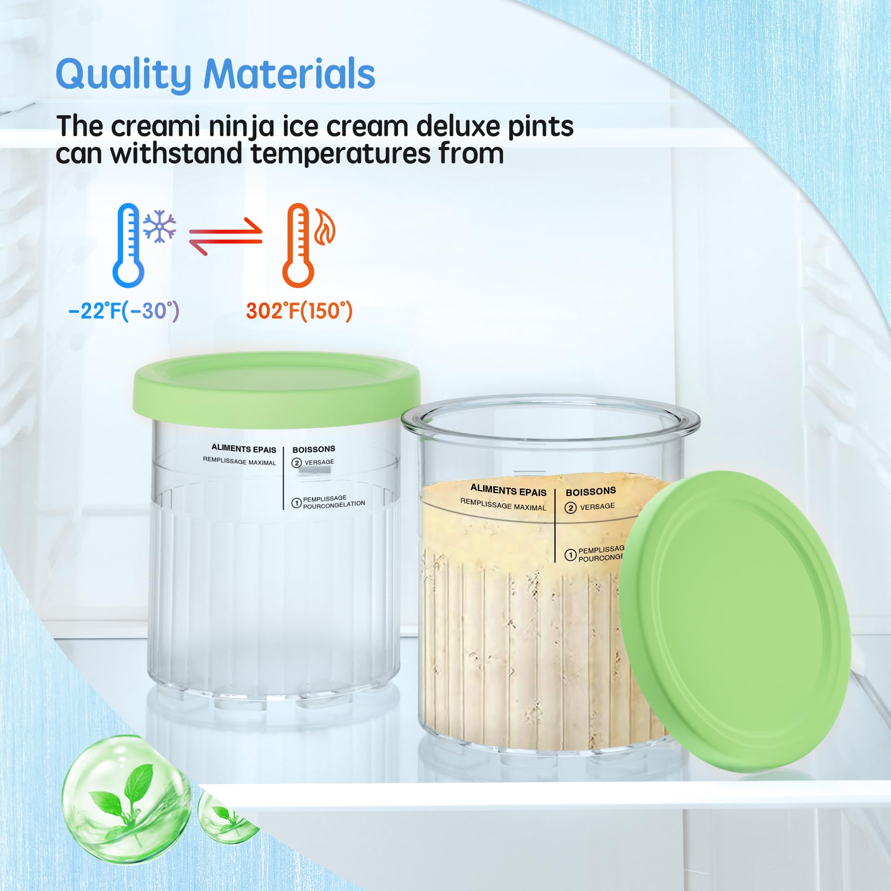 PERFECT FIT MODEL: Compatible with Ninja NC500/NC501 Creami Deluxe 11-in-1 XL Ice Cream Makers. 24 OZ transparent pints with 4 green lids - perfect for creating multiple ice cream varieties simultaneously, while making different flavors of ice cream for family & friends.