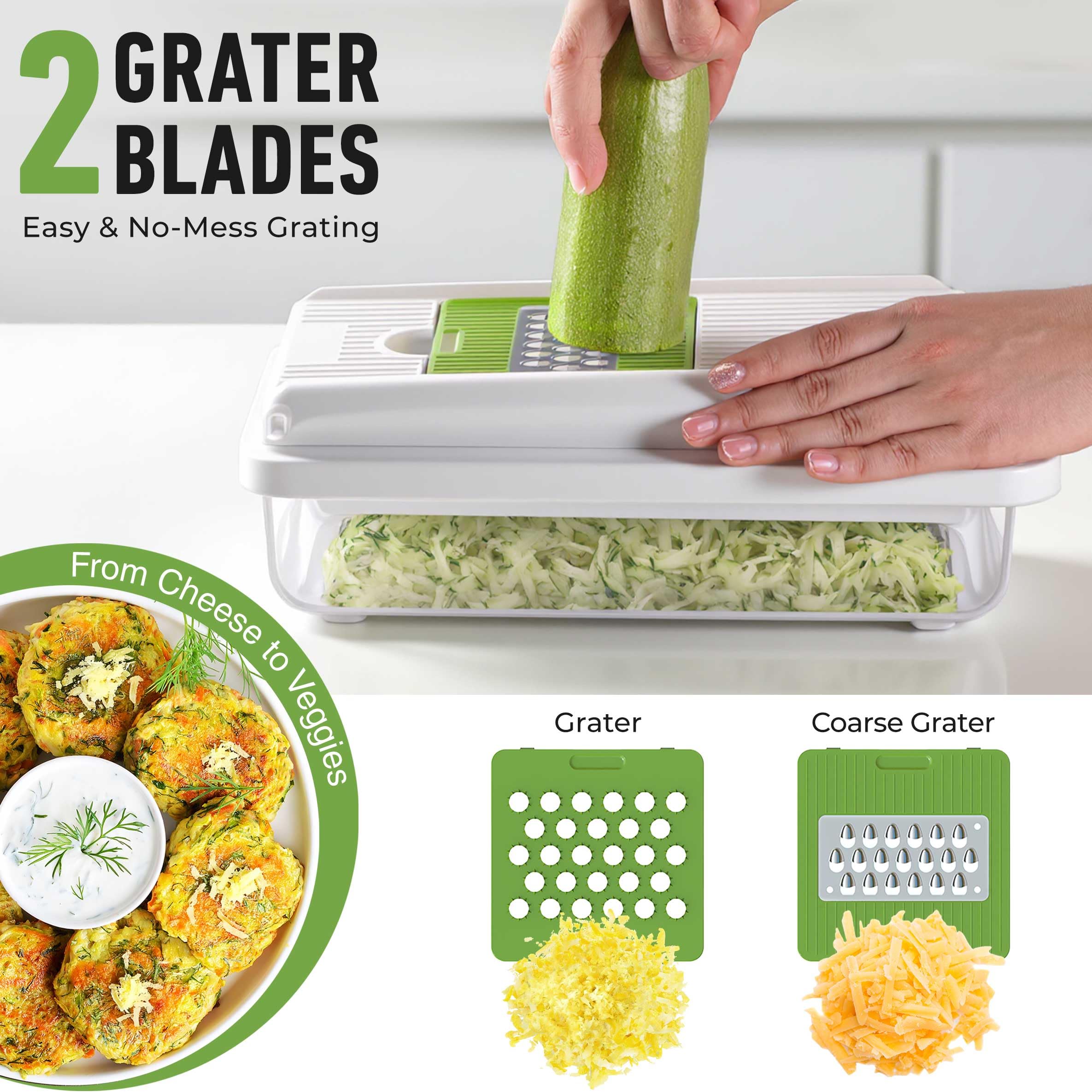 6 Awesome Blades For the Price of 4 - Two different sized chopper blades, 4 interchangeable blades for slicing, julienne & grating offer the functionality of multiple kitchen tools in just one, highly versatile kitchen gadget. The high-quality stainless-steel blades allow you to quickly and efficiently chop onions, prepare peppers for salsa, or shred an entire cabbage for coleslaw in no time.