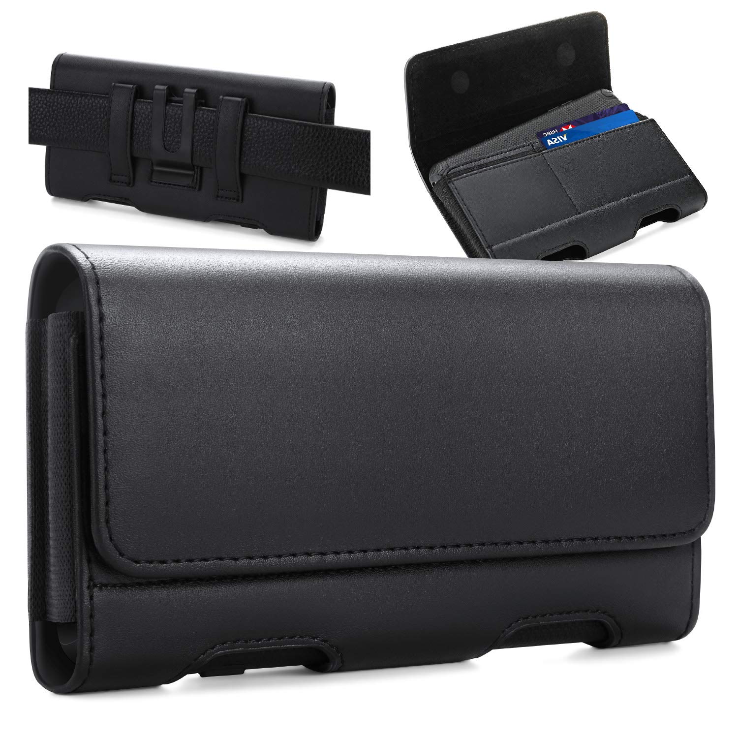 Magnetic self-closing flap with two ID card slots.Durable Belt Clip and 2 additional secure belt loops and front magnetic closure. (Belt Clip does not move or turn)