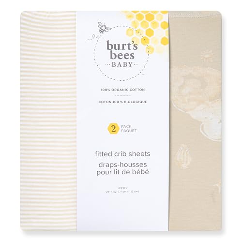Embrace the comfort of the Burt's Bees Baby Fitted Crib Sheet, a nursery and baby registry gift essential. Crafted with care from 100% organic GOTS-certified* cotton, this sheet is a sanctuary of comfort for your baby's delicate skin. Combed and ring-sun, these sheets are super soft, durable, and breathable, promoting restful sleep for your baby. Our BeeSnug 360 design ensures a snug fit for standard cribs and toddler mattresses, making it a versatile choice for any nursery. These easy-care, machine-washable sheets get softer with every wash while the patterns remain vibrant. Available in a variety of adorable hand painted watercolor prints suitable for baby boys and baby girls, our sheets not only complement your nursery décor but also serve as a cherished essential for any parent. From floral patterns to animal and geometric patterns, you can mix and match to find the perfect crib sheet to match your nursery theme. Our classic jersey knit fabric gives your little bee the same feeling you get when you slip into your favorite t-shirt. It is warmer to the touch than woven sheets, providing a smoother transition from snuggling in your arms to safely sleeping in their crib. *GOTS Certified by CU 831717