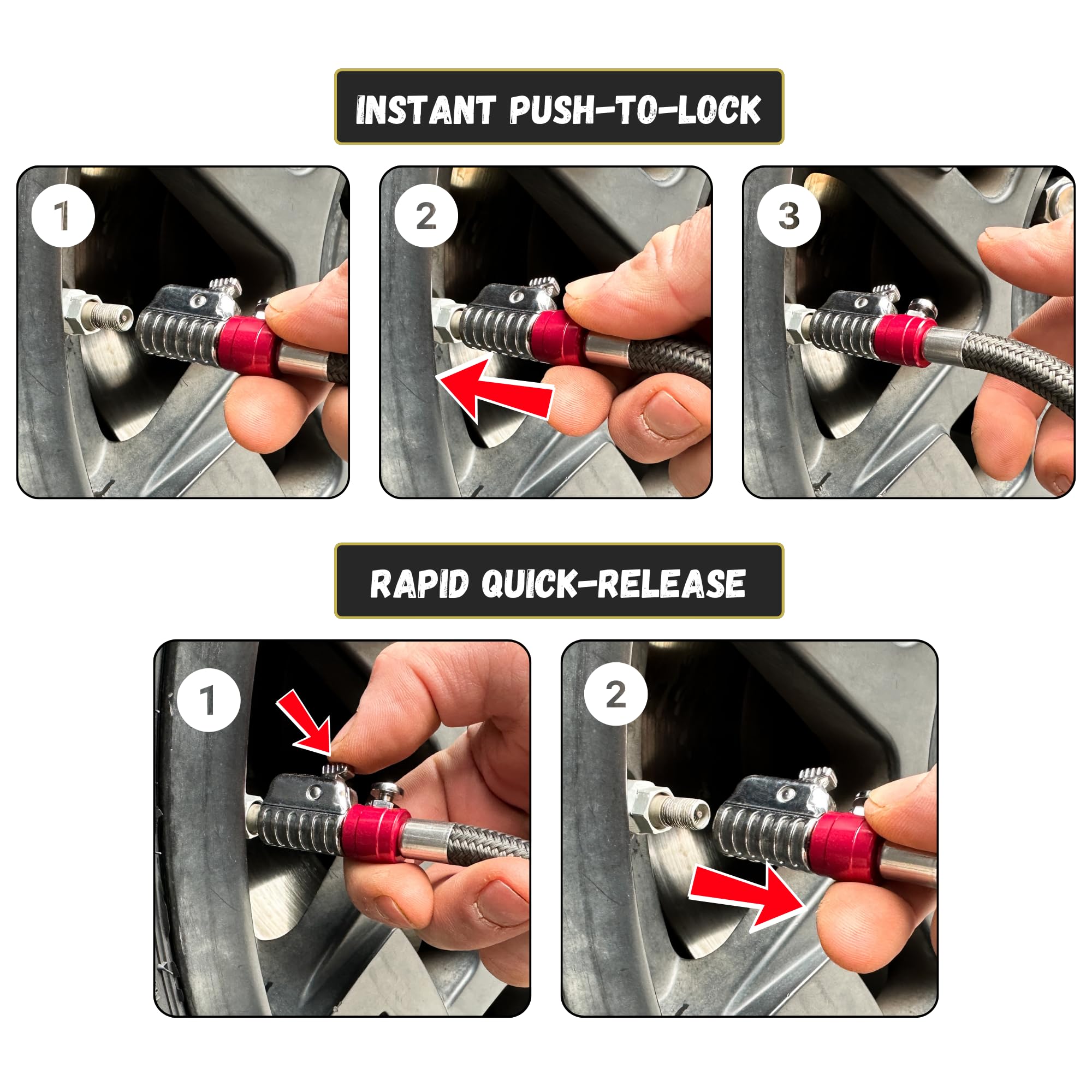 QUICK-RELEASE: Instantly disconnect from the tire valve with zero air loss using the quick-release button.