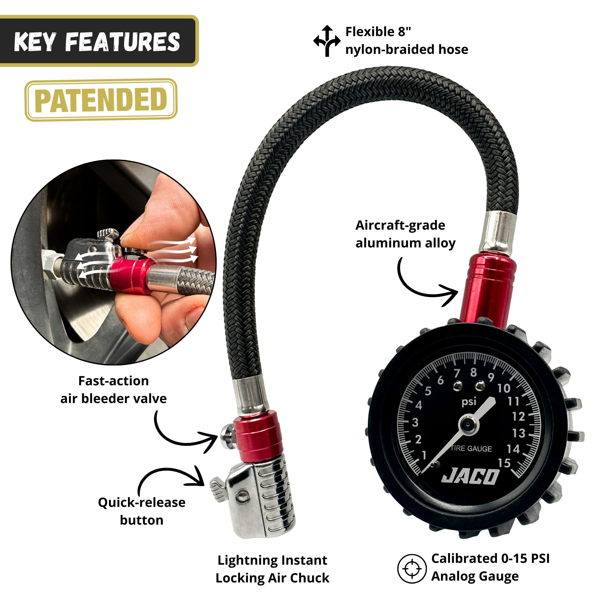 LIGHTNING CHUCK: Features a patented push-to-lock nozzle that instantly locks onto tire valve stems with a simple push, creating a secure, airtight seal—no need to manually apply pressure for a proper reading.