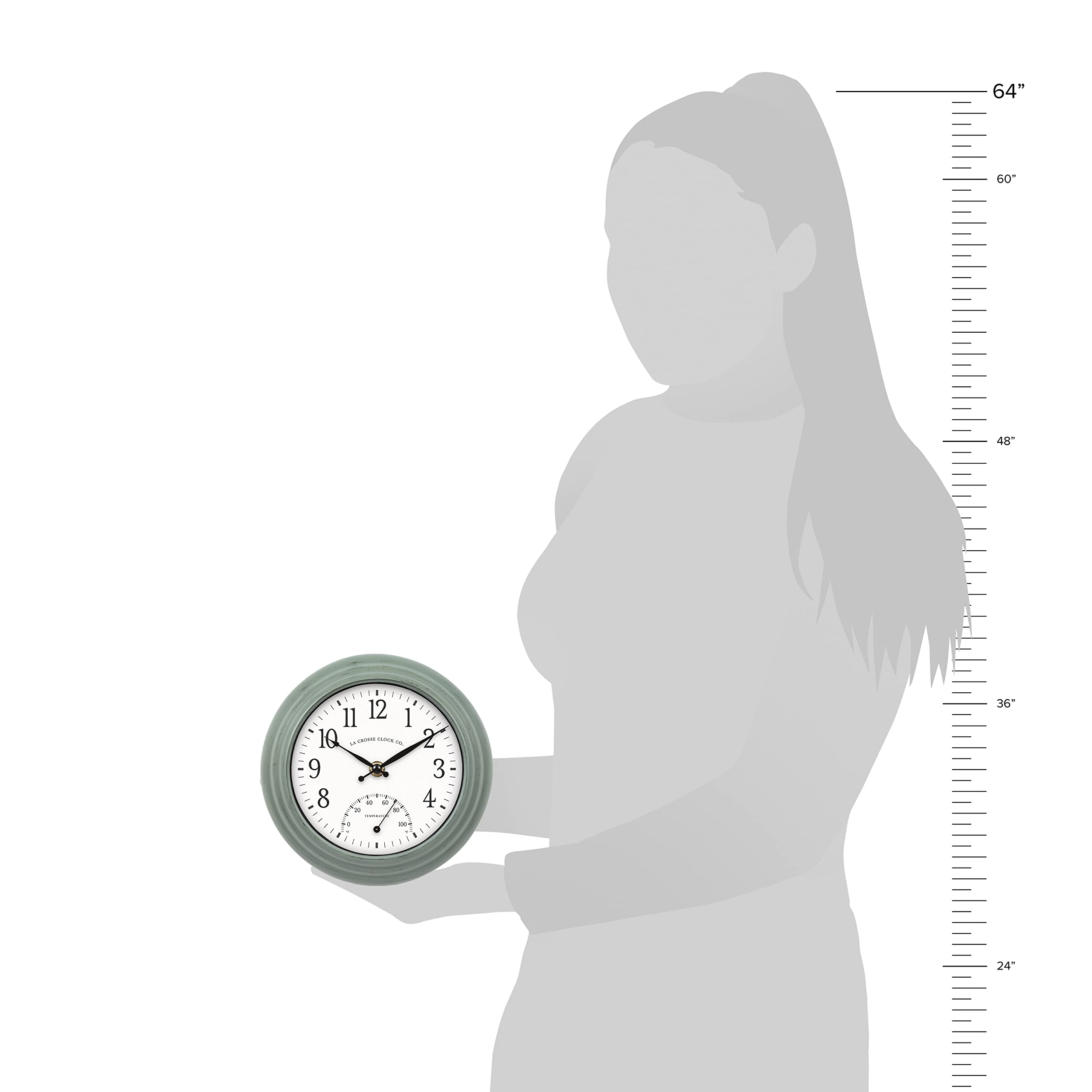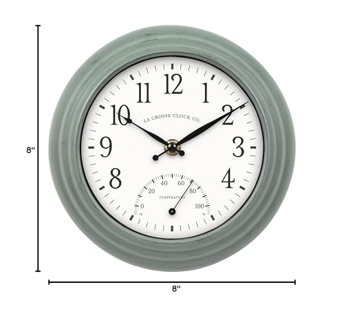La Crosse Clock Company’s 8-Inch Sage green analog clock is the perfect accent for indoor or outdoor spaces. Classic styling with Arabic numbers and weathered finish plastic frame make this timepiece as stylish as it is functional. In addition to time, keep tabs on ambient temperature with precise gauges. Equipped with a protected UV dial from sun exposure, its sure to last. For lasting enjoyment, we recommend hanging the clock under an overhang to protect from extreme elements. Operates on single (not included) AA alkaline battery.