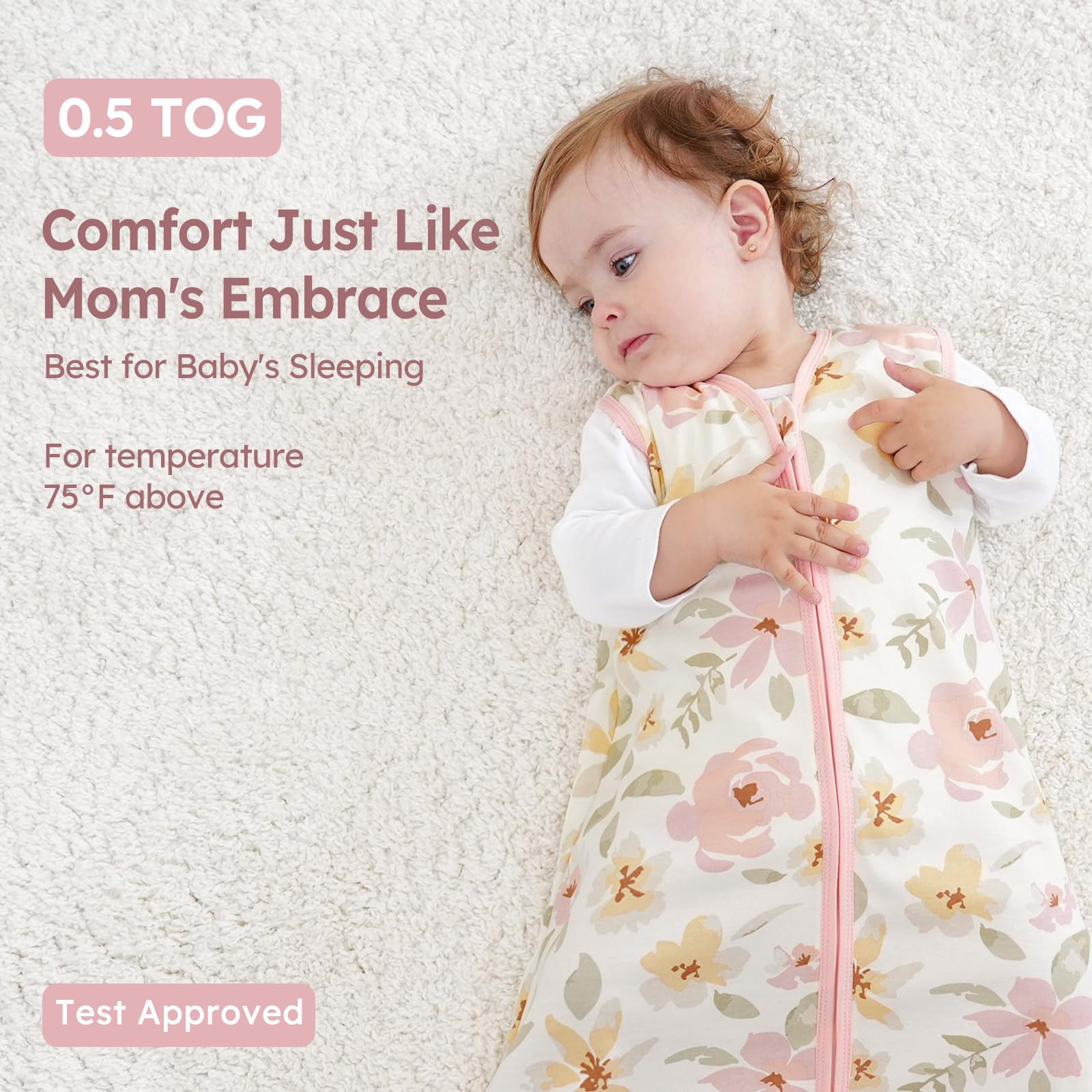 EASY DIAPERING-2 way zipper runs from the top to the bottom, making the lightweight sleep sack much convenient to change diapers without any interruption, especially during midnight. Equipped with zippe guard prevent rubbing on your baby's sensitive skin and protects baby's chin. Tog rating 0.5, making it perfect for nursery room temperature 75°F above.