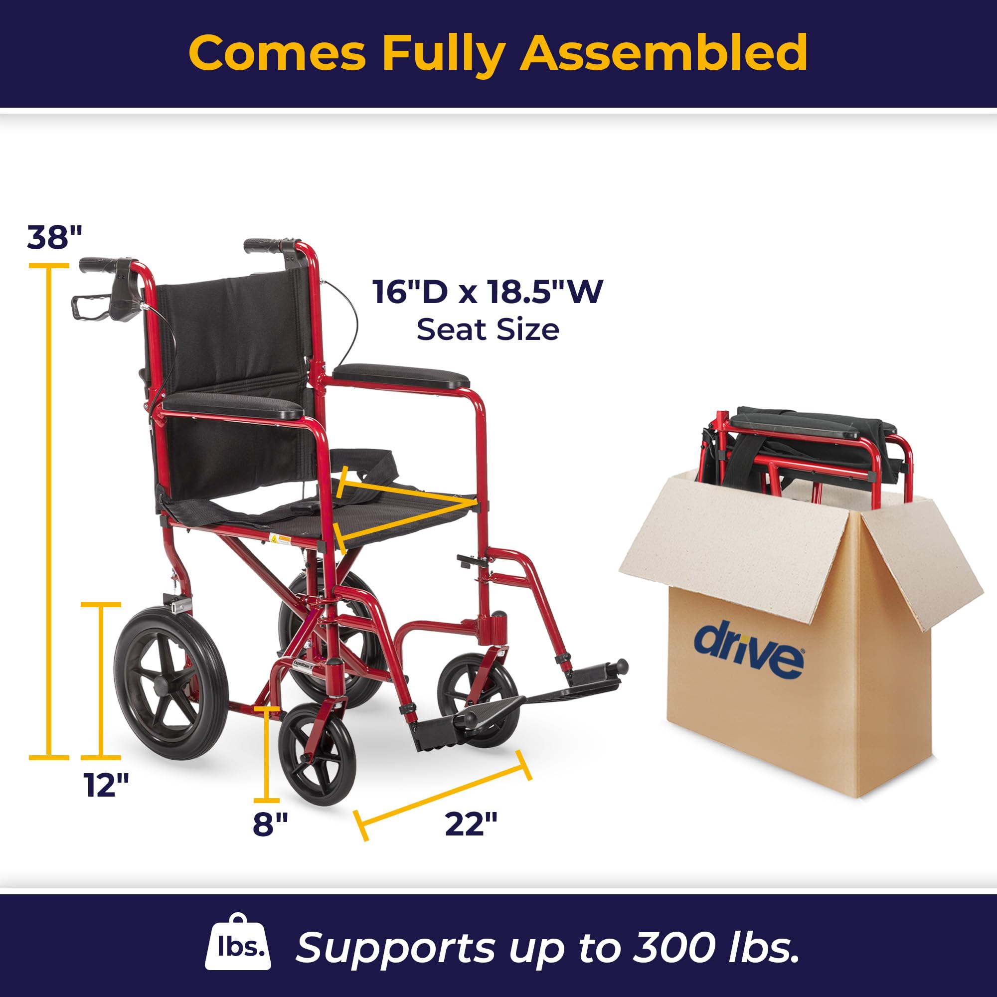 Drive Medical's lightweight transport chair weighs just 19 pounds, yet is expertly designed to ensure safety and support up to 300 pounds. Featuring 12-inch rear tires that can navigate both indoor and outdoor terrain, the aluminum Expedition transport wheelchair is versatile and reliable. It folds like a conventional folding chair and comes standard with fold-down footrests for added convenience and comfort. Companion-activated wheel locks under the handles and seat belt ensure safety, while a simple lever on the chair back allows for quick, flat transport and storage. A great choice for anyone looking for portable lightweight wheelchairs for travel or everyday transport. Backed by a limited lifetime warranty from Drive Medical, a leading brand of mobility aids and other medical goods for more than 20 years, you can purchase with confidence.