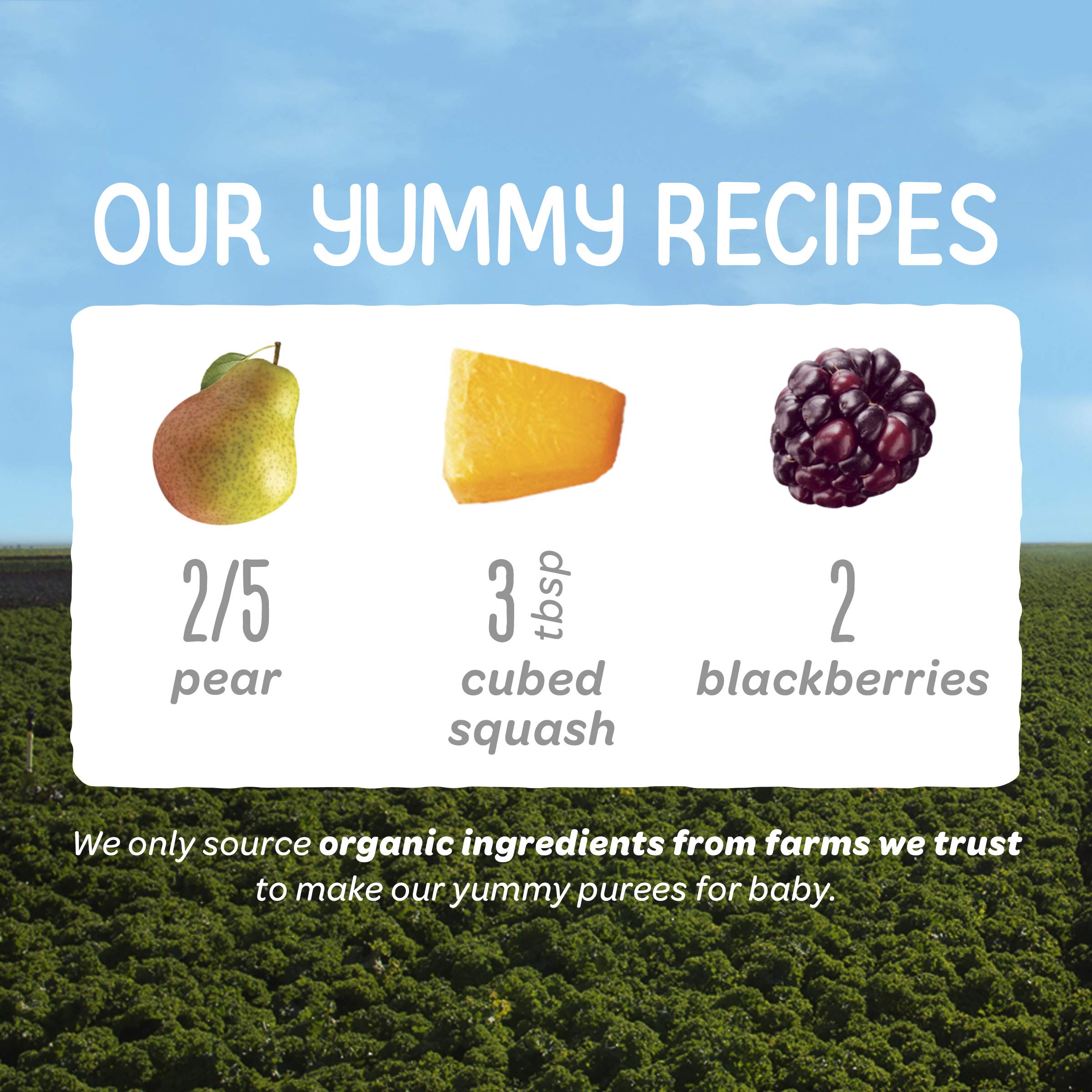 Our Stage 2 baby food pouches introduce baby to new, yummy organic ingredients. Baby will love the fun flavors of this purple puree as much as you love the wholesome ingredients: organic pear and butternut squash blended with sweet, tangy blackberries.