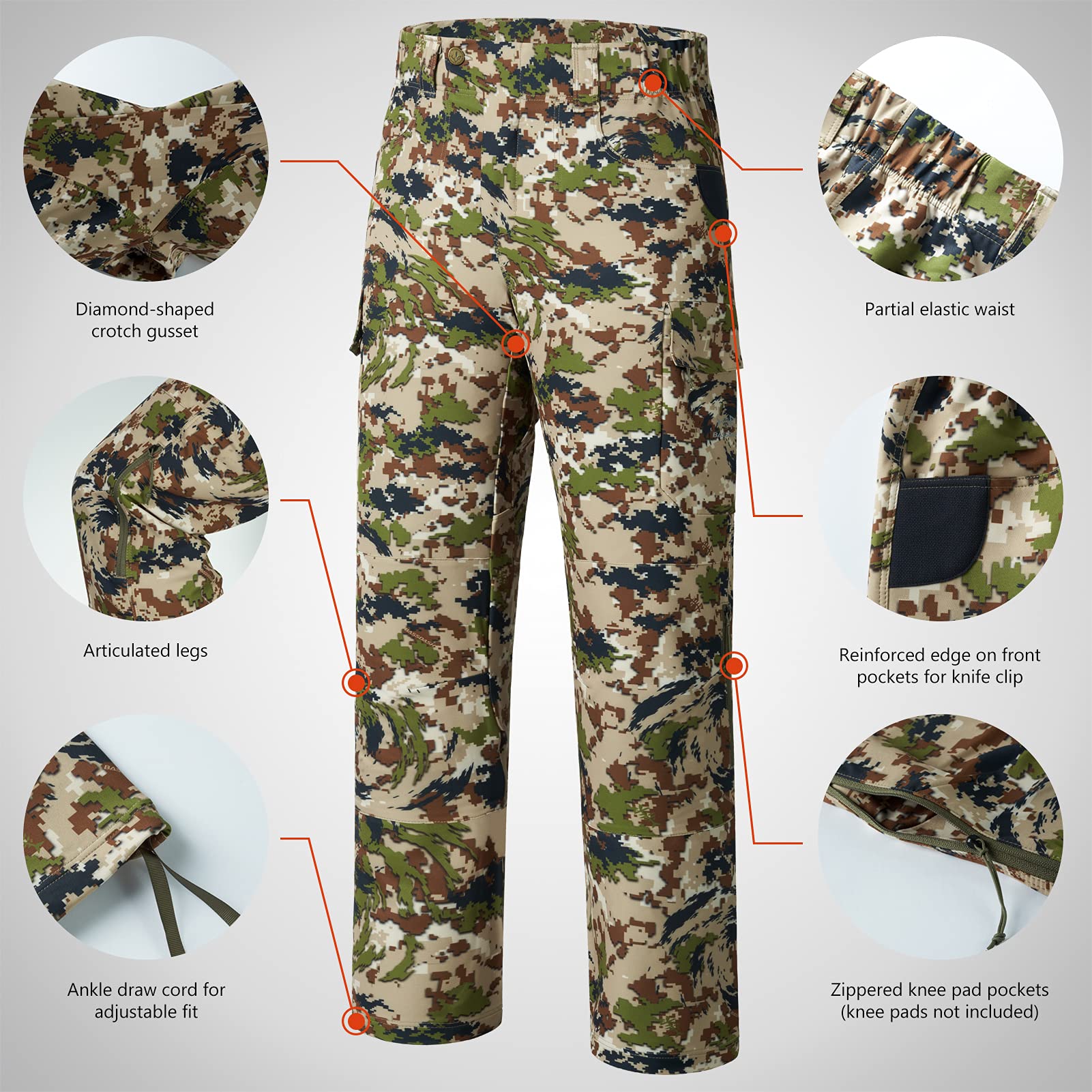 Silent, four-way stretch fabric with water resistant treatment and superior breathability offers freedom of movement and throughout comfort for long miles in the field; All in Bassdash unique concealing camo colors