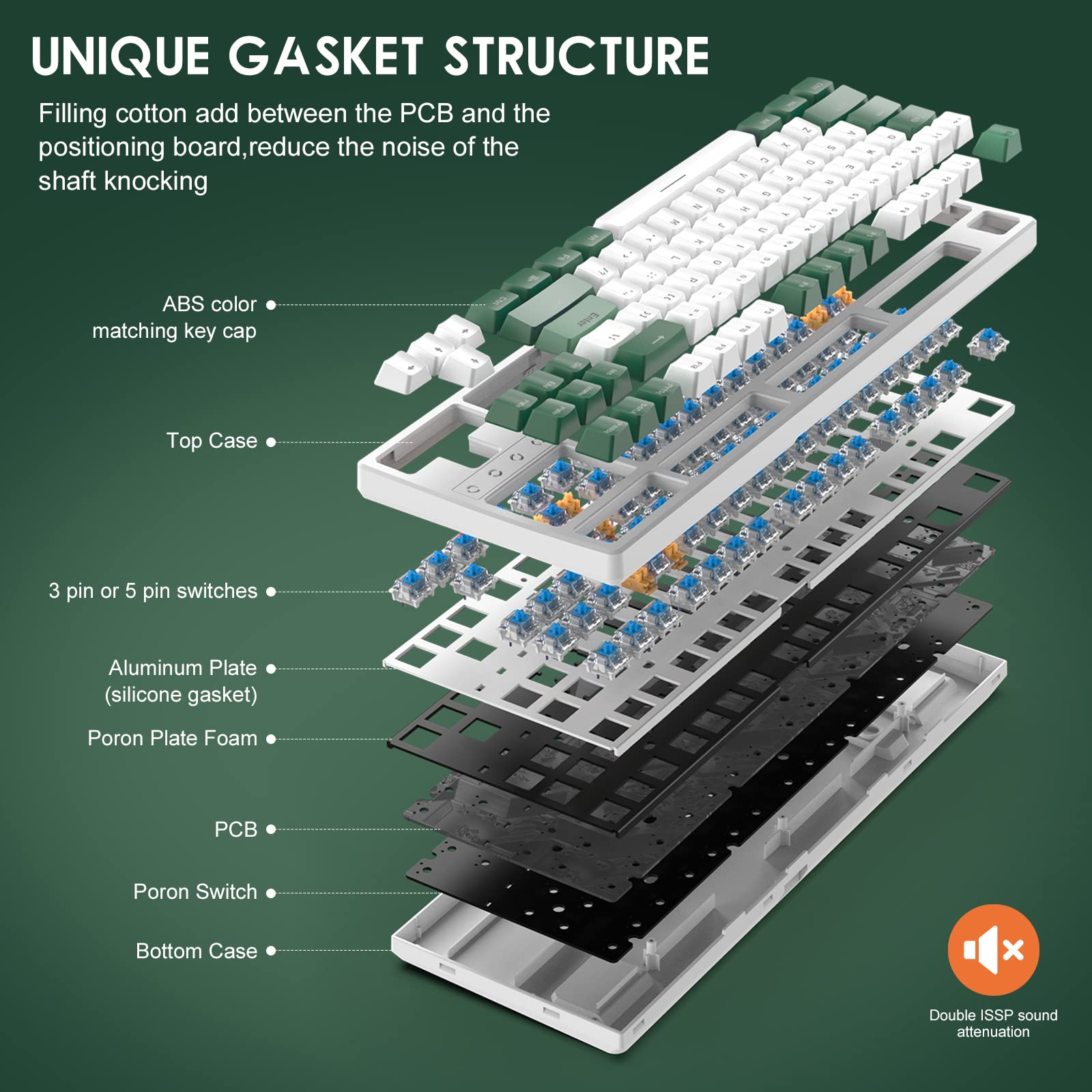 【Dual Layer Sound Absorbing Silicone Pads】To achieve ultimate typing and gaming experience,The K87 Bluetooth keyboard adopts special structural design and dual layer silicone pads which are precisely designed both in structure and function.Two layers of silicone pads are placed respectively in the bottom and under the plate for better sound absorption.
