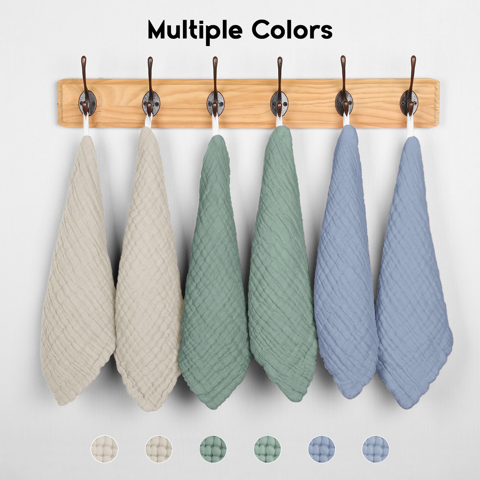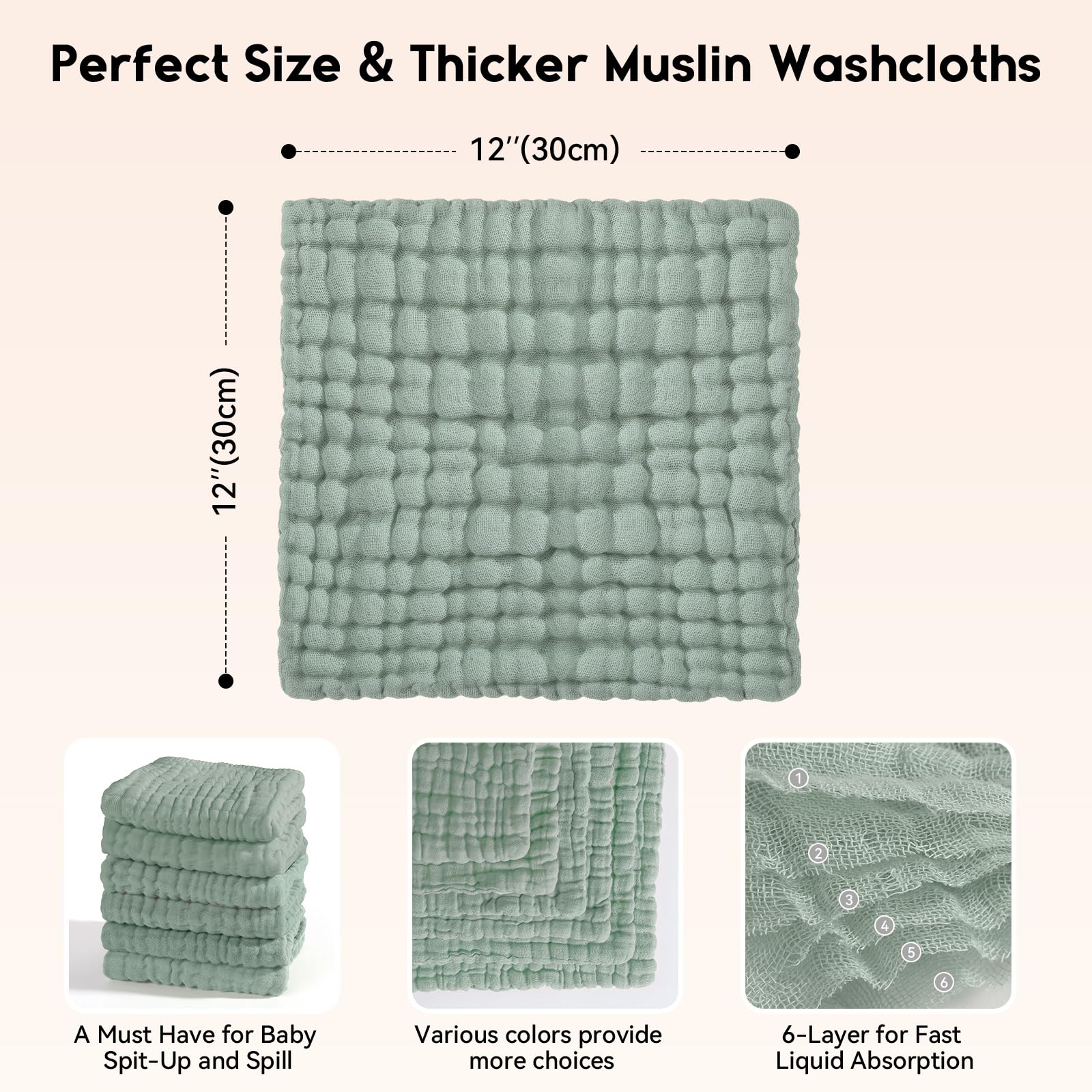 Pratical Design: The 6 pack baby muslin washcloths are thoughtfully designed in a generous size of 12"x12", offering a perfect balance between functionality and portability. Lanyard design make it easy to hang or dry, avoid germs accumulating. Reinforced edges make the muslin washcloths can withstand repeated washing while retaining its shape.