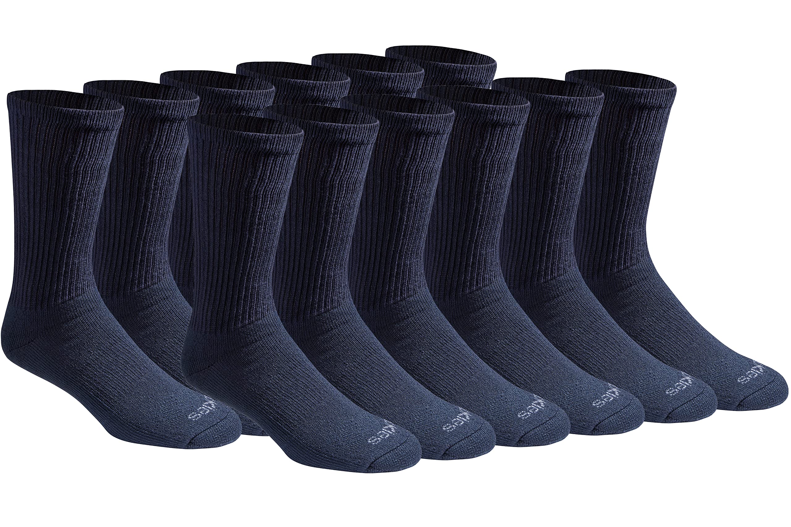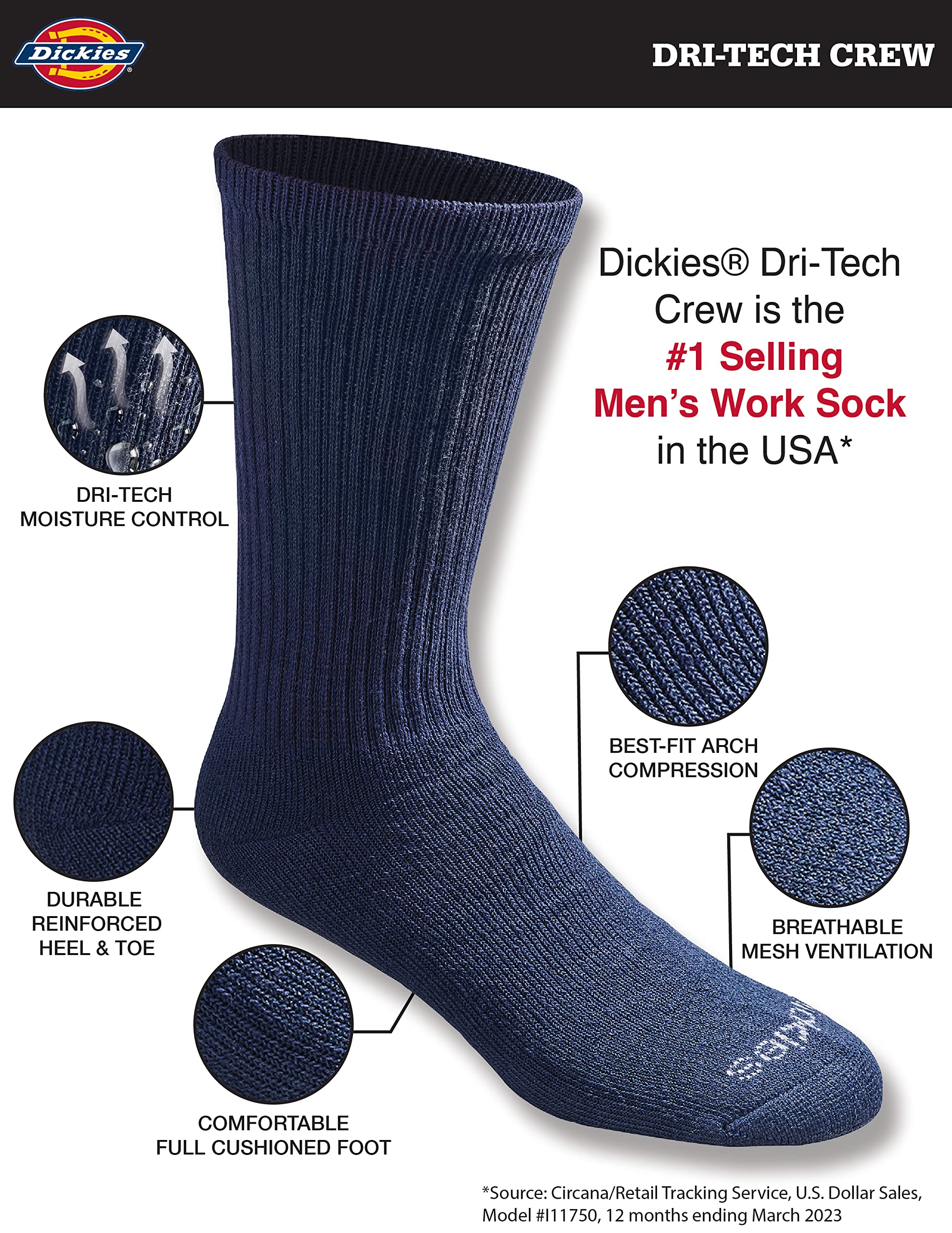Description Dickies dri-tech comfort 6 Pairs crew with wicking, moisture management fibers keeps feet dry, ventilation channels engineered for air circulation and moisture control, arch compression hugs feet and keeps socks in place, while providing in-step support, Reciprocated heel and toe for superior fit and full cushion comfort