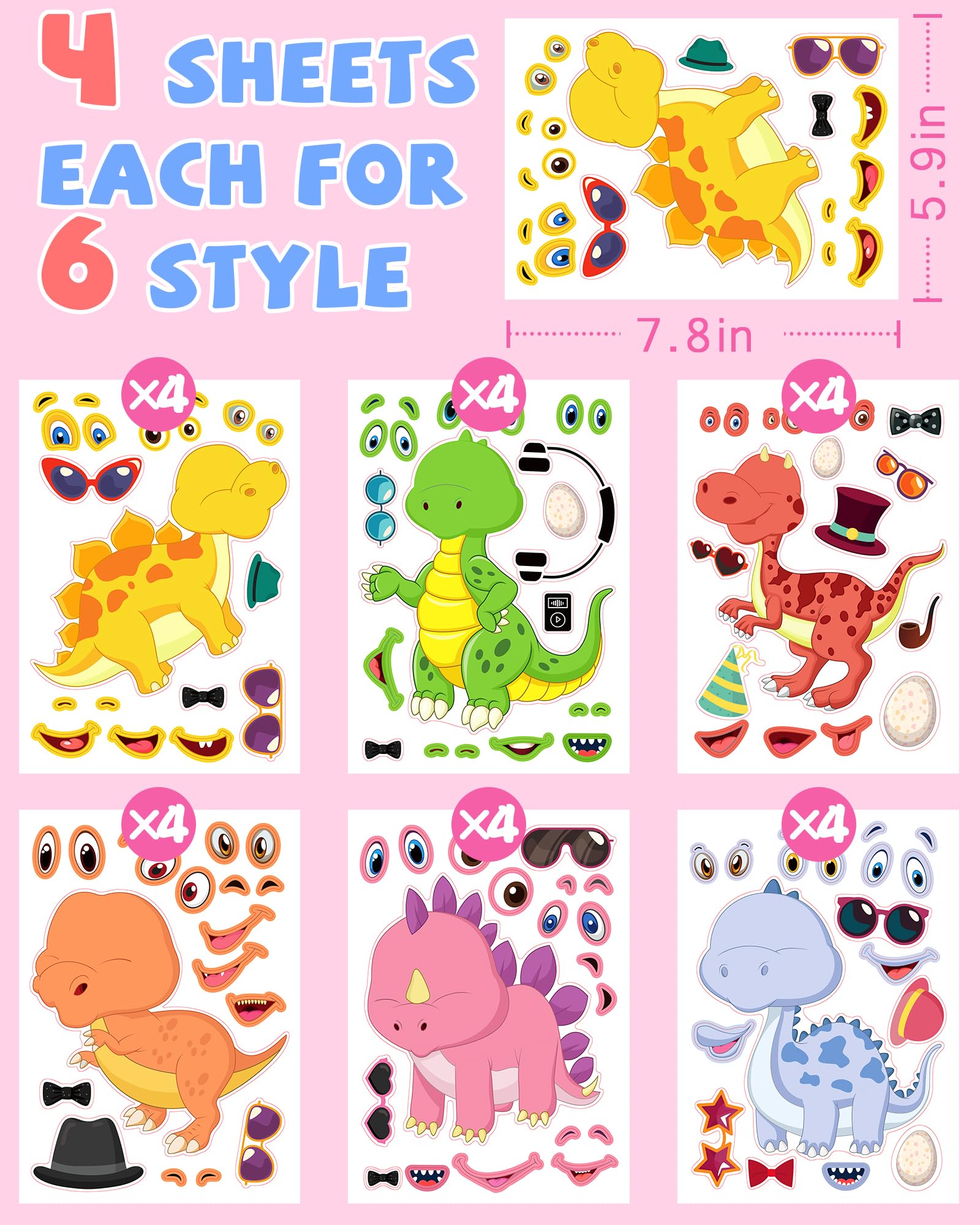 24 MAKE YOUR OWN STICKERS: 4 sheets dinosaur stickers include 6 kinds of dinosaurs, each style has 4 sheets to fulfill your decorating needs. 7.8 inches × 5.9 inches per sheet. Large size makes it easier for kids to operate.