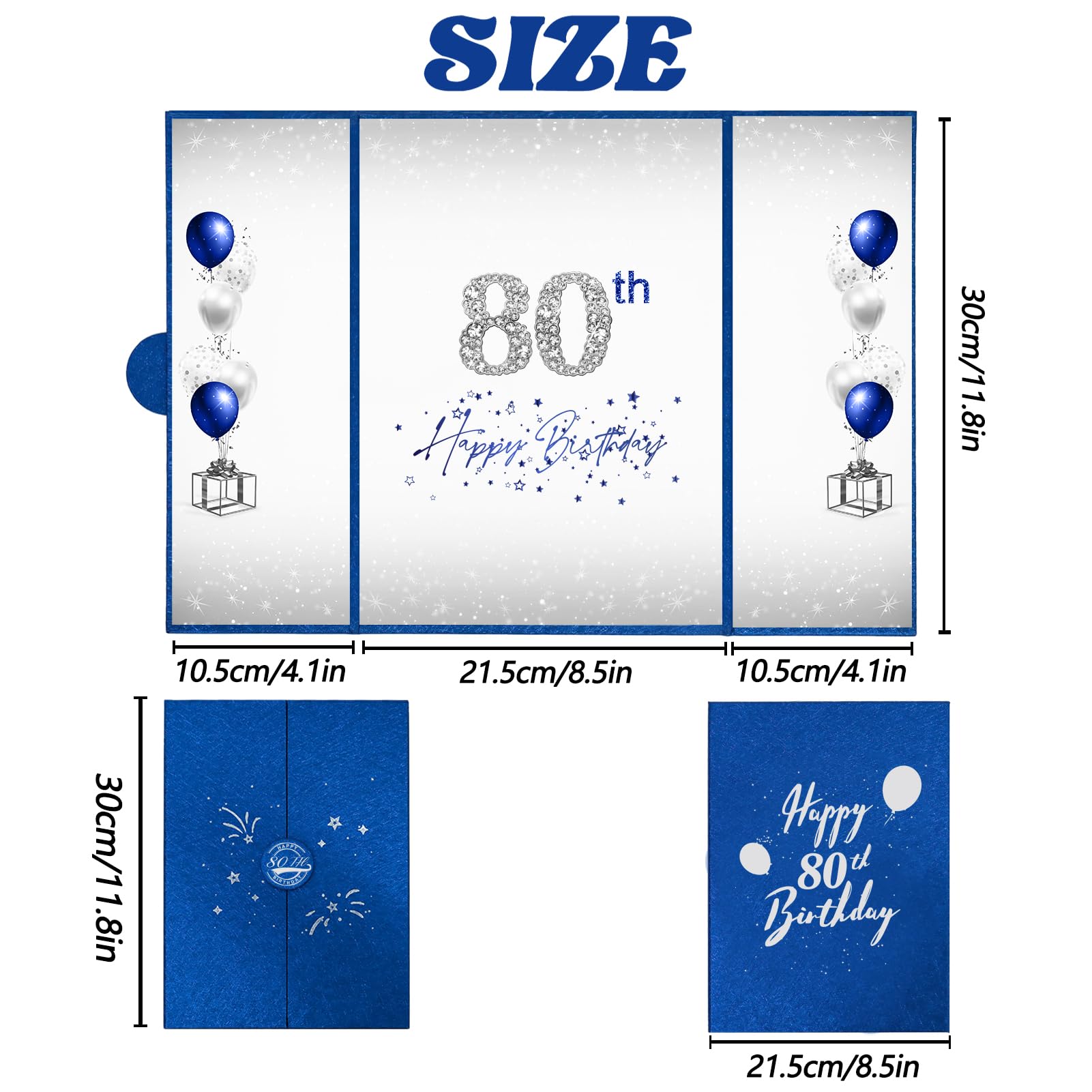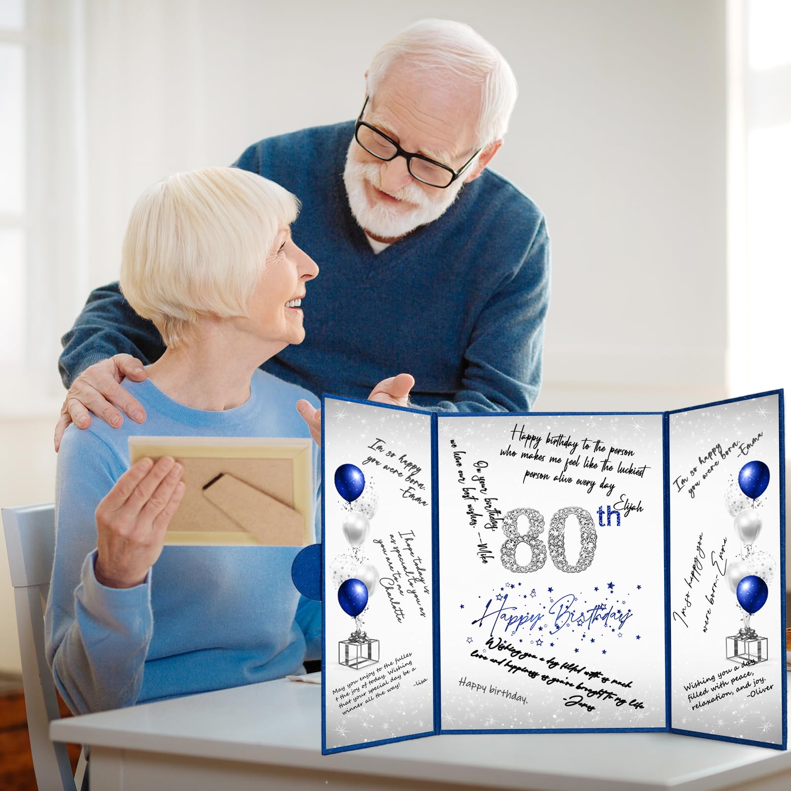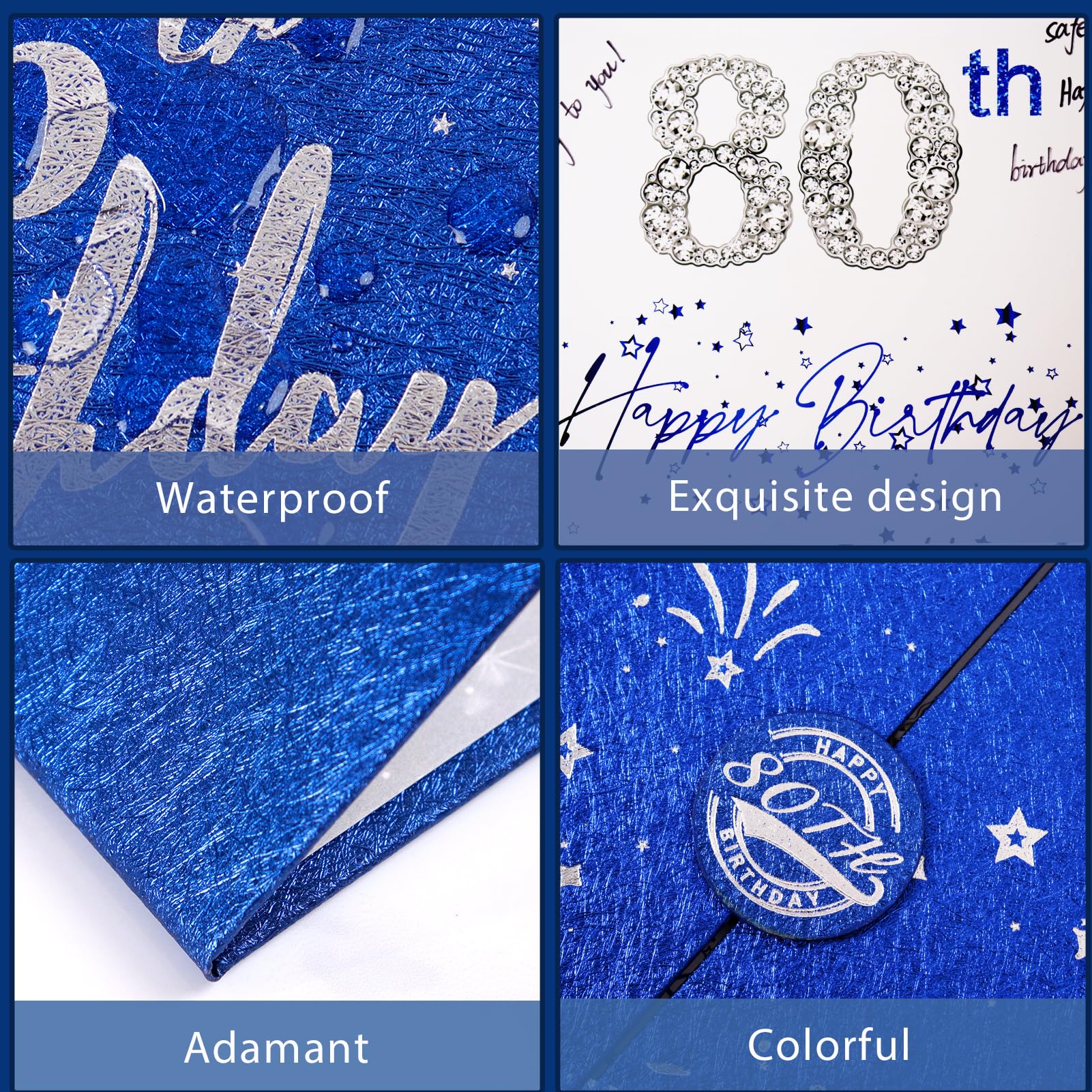 【Exquisite Design】- The blue and silver certificate has a gilded badge on the cover, and the inside of the signature certificate is divided into three parts, the middle page is printed with the message '80th Happy Birthday'. This 80th birthday signature board can be opened directly and stand on the table. Tips: No pen.