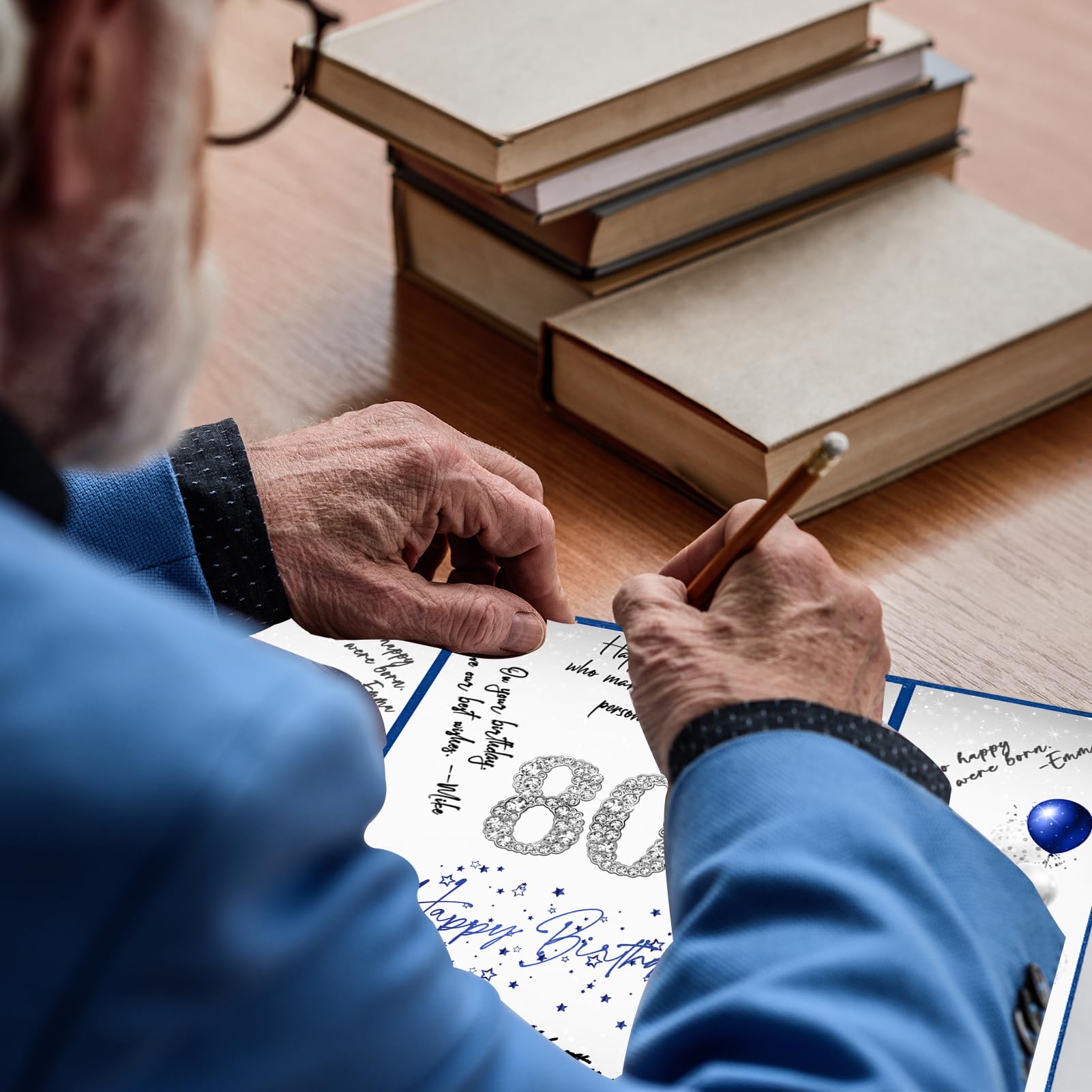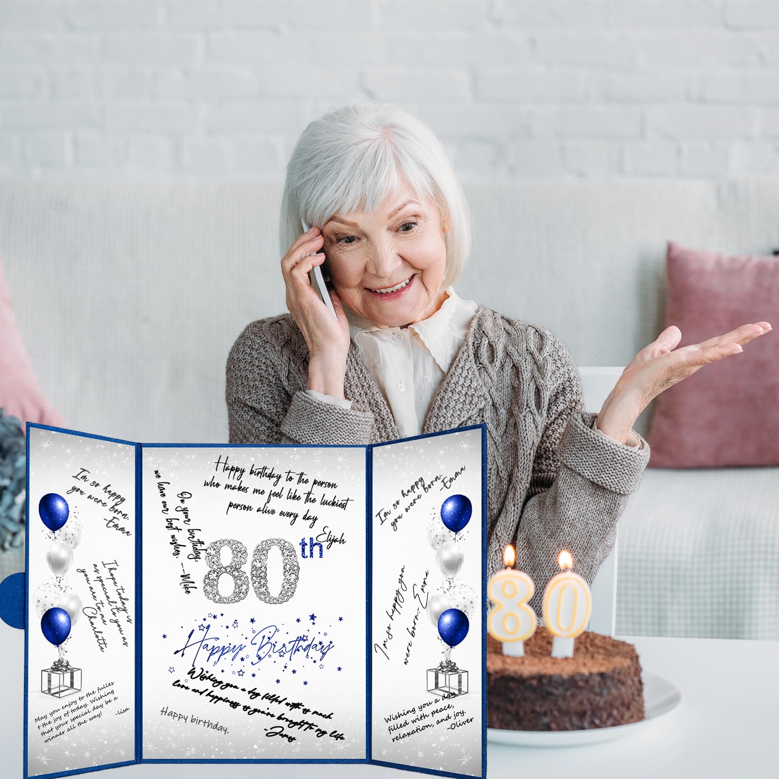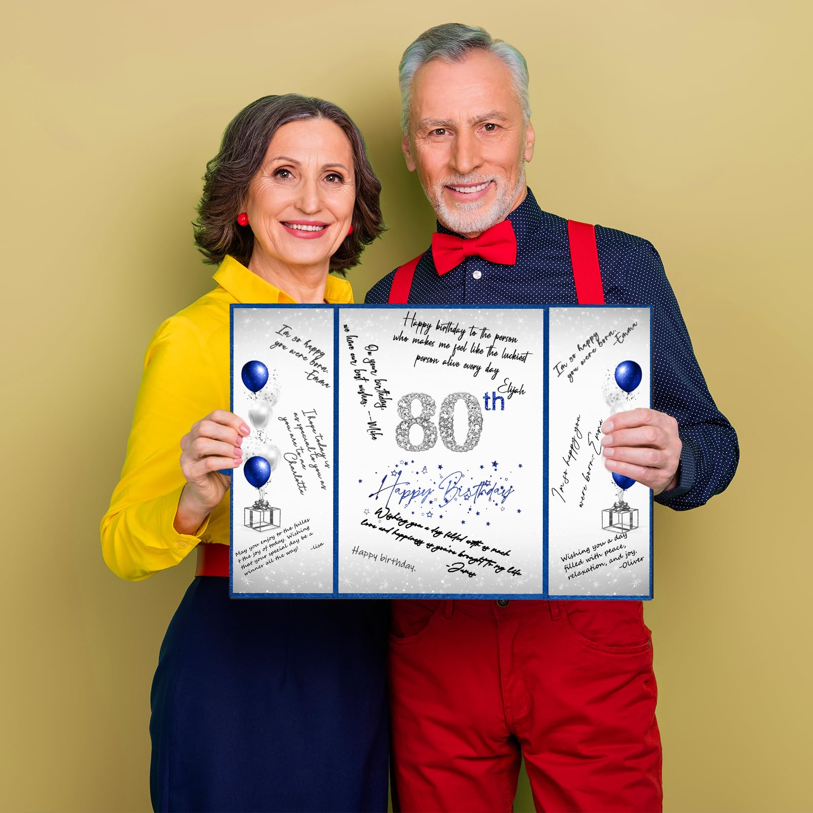 【Exquisite Design】- The blue and silver certificate has a gilded badge on the cover, and the inside of the signature certificate is divided into three parts, the middle page is printed with the message '80th Happy Birthday'. This 80th birthday signature board can be opened directly and stand on the table. Tips: No pen.