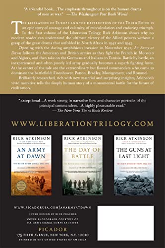 WINNER OF THE PULITZER PRIZE AND NEW YORK TIMES BESTSELLER In the first volume of his monumental trilogy about the liberation of Europe in World War II, Pulitzer Prize winner Rick Atkinson tells the riveting story of the war in North Africa. The liberation of Europe and the destruction of the Third Reich is a story of courage and enduring triumph, of calamity and miscalculation. In this first volume of the Liberation Trilogy, Rick Atkinson shows why no modern reader can understand the ultimate victory of the Allied powers without a grasp of the great drama that unfolded in North Africa in 1942 and 1943. That first year of the Allied war was a pivotal point in American history, the moment when the United States began to act like a great power. Beginning with the daring amphibious invasion in November 1942, An Army at Dawn follows the American and British armies as they fight the French in Morocco and Algeria, and then take on the Germans and Italians in Tunisia. Battle by battle, an inexperienced and sometimes poorly led army gradually becomes a superb fighting force. Central to the tale are the extraordinary but fallible commanders who come to dominate the battlefield: Eisenhower, Patton, Bradley, Montgomery, and Rommel. Brilliantly researched, rich with new material and vivid insights, Atkinson's narrative provides the definitive history of the war in North Africa.