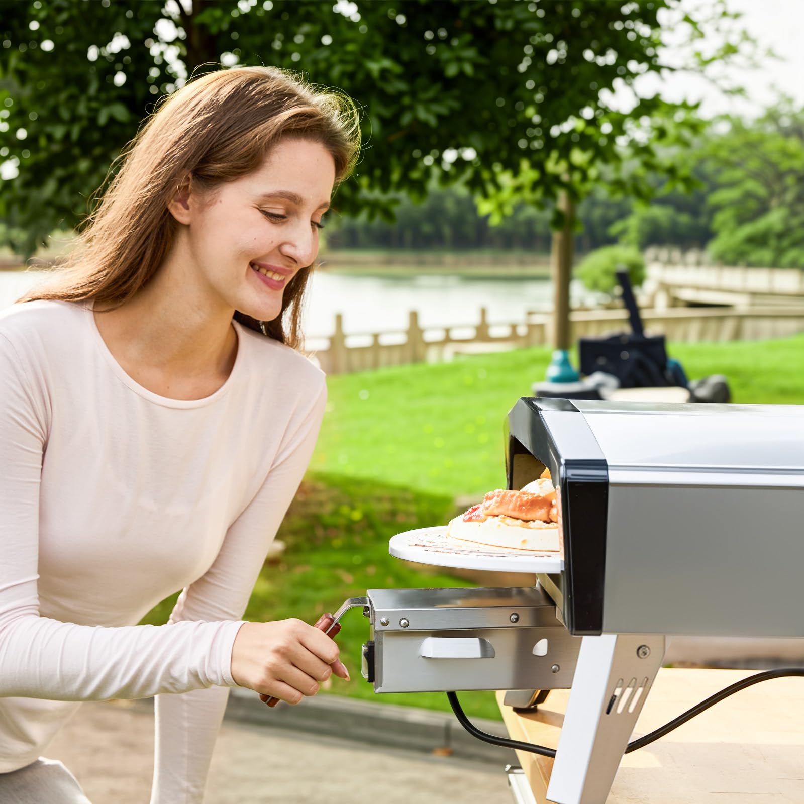 [Multi-Functional Pizza Oven] - This rotating pizza oven can make more than just pizza, using a pizza pan, skillet or griddle instead of a pizza stone. It roasts chicken, beef, steaks, burgers, fish, bread and vegetables, bake pastries, grill sausages. Ideal for family gatherings and outdoor camping