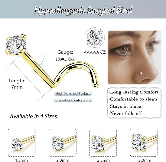 🆕Variety of Sizes Set: 8pcs nose studs in a set, All Gauge--18G(1.0mm); Pin Length: 7mm; Cubic Zirconia Size: 1.5/2/2.5/3mm. The multi-size set is designed to suit your everyday style. The 18Gauge nose piercings stud, adorned with a sparkling crystal, not only enhances your allure but also complements any outfit flawlessly