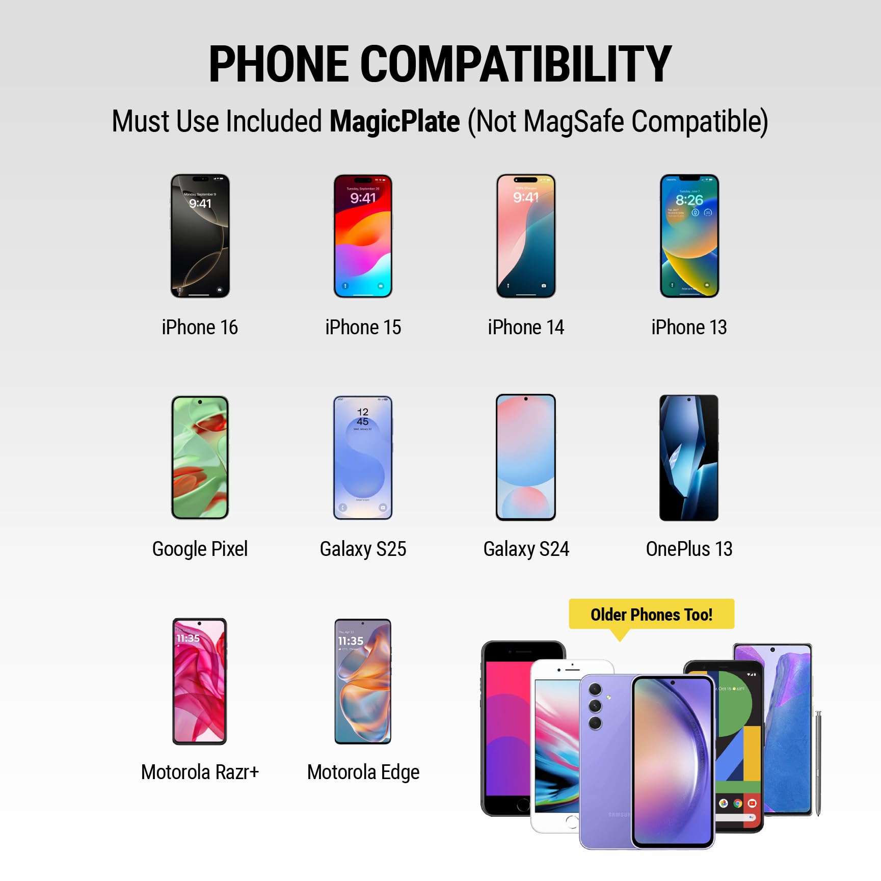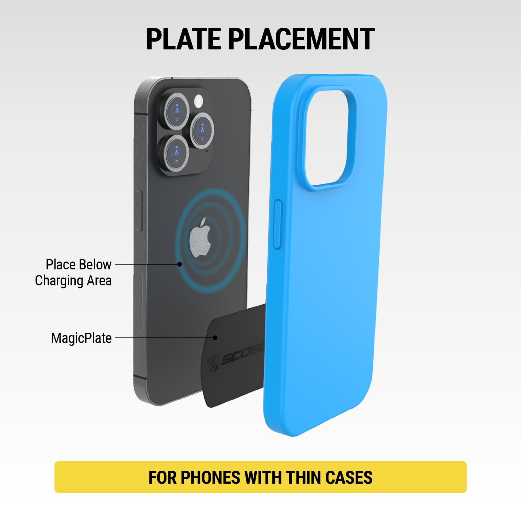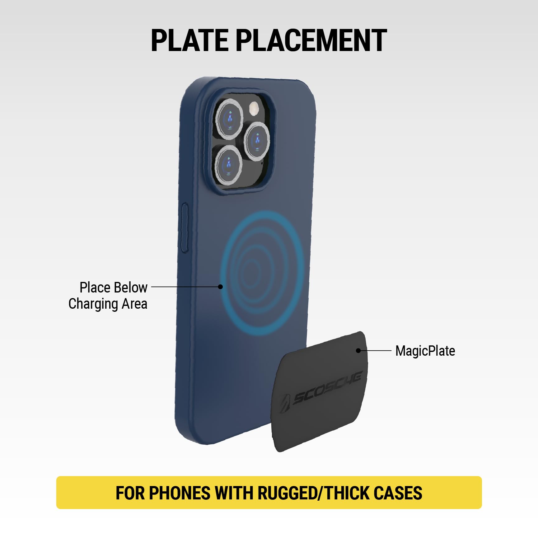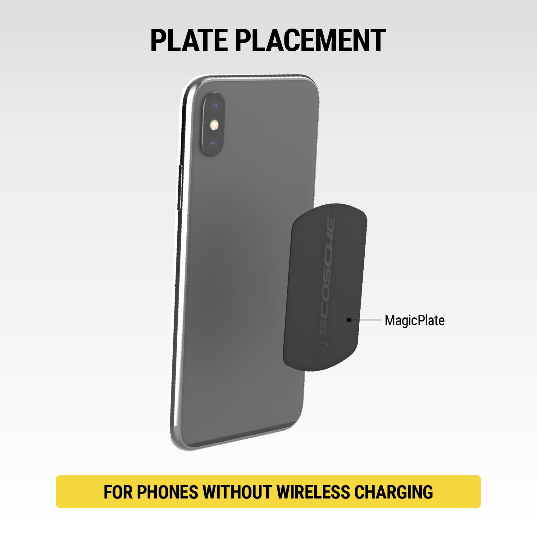 MagicPlate Placement: To achieve a strong hold with larger and heavier cell phones or tablets, place the extra strength Scosche MagicPlate directly on your device or on the exterior of the case. Refer to the images for recommended placement of your metal plate for magnet phone mount holder and enjoy magnetic mounting without interfering with wireless charging.