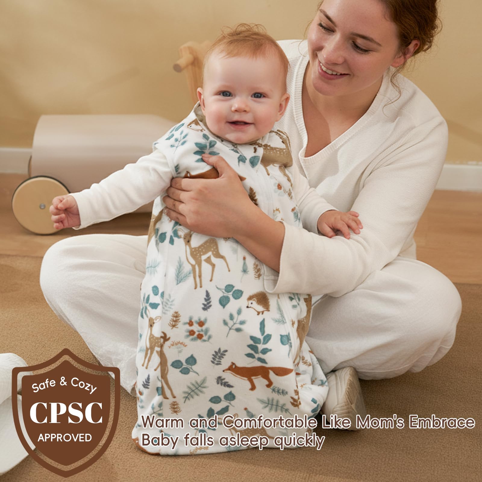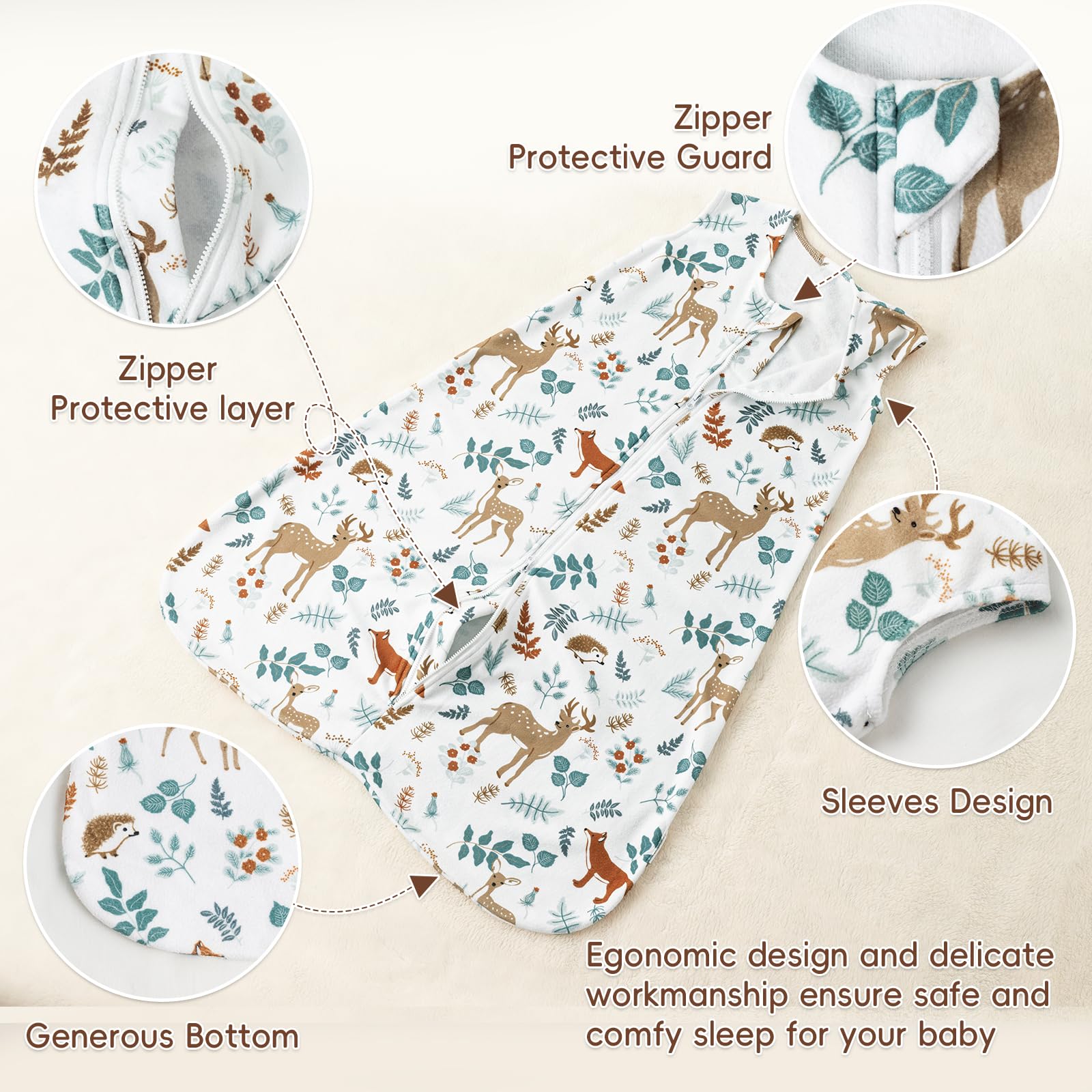 Our baby wearable blankets are made of 100% polyester micro-fleece that is very soft and gentle on babies' delicate skin. The skin-friendly fabric with 1.5 TOG makes them the perfect choice to keep your little one warm and comfortable during cold winter nights. Our baby sleep sacks are breathable and moisture-wicking, so your baby can enjoy a full night of restful, uninterrupted sleep. Our baby wearable blankets are Essential Baby Item for everyday use.