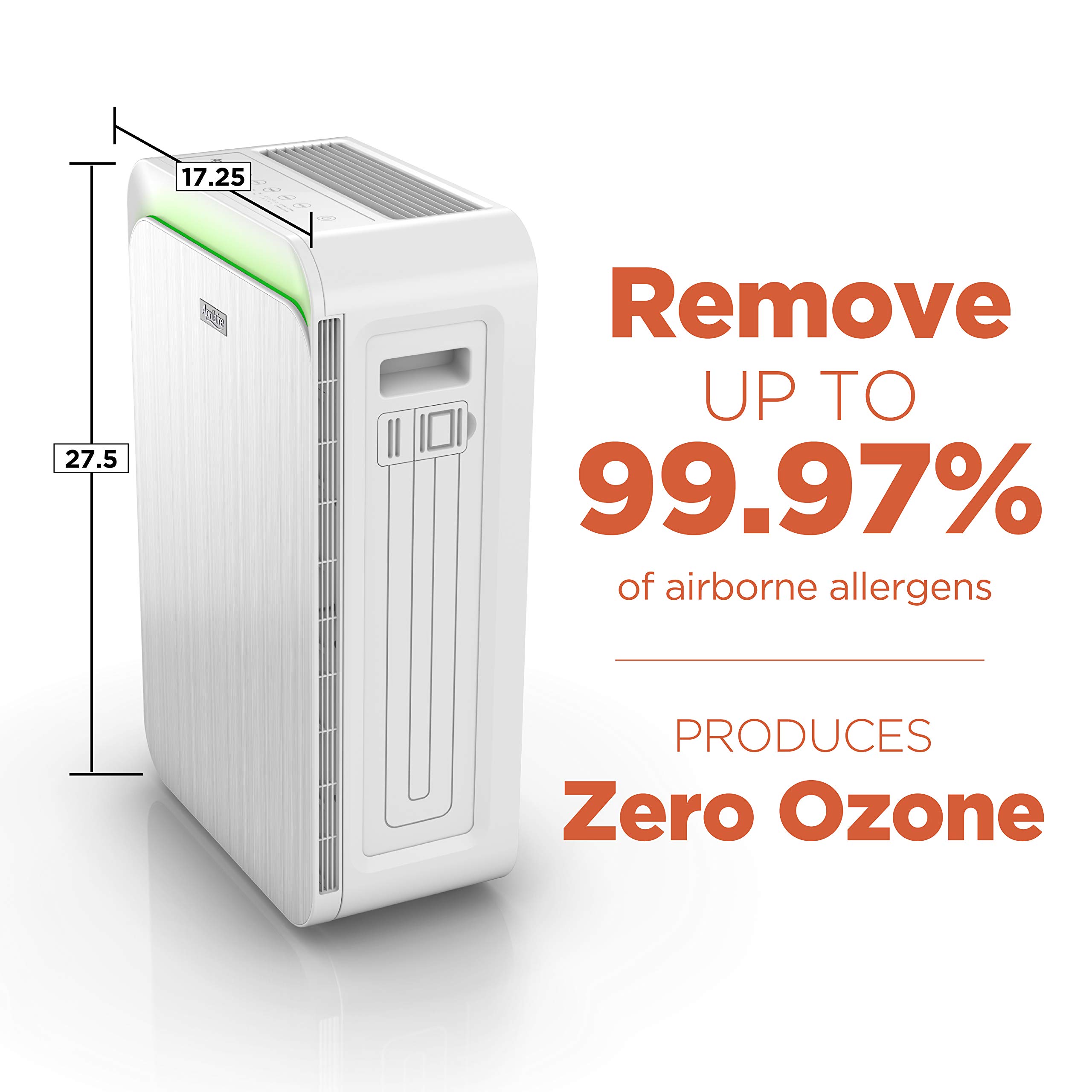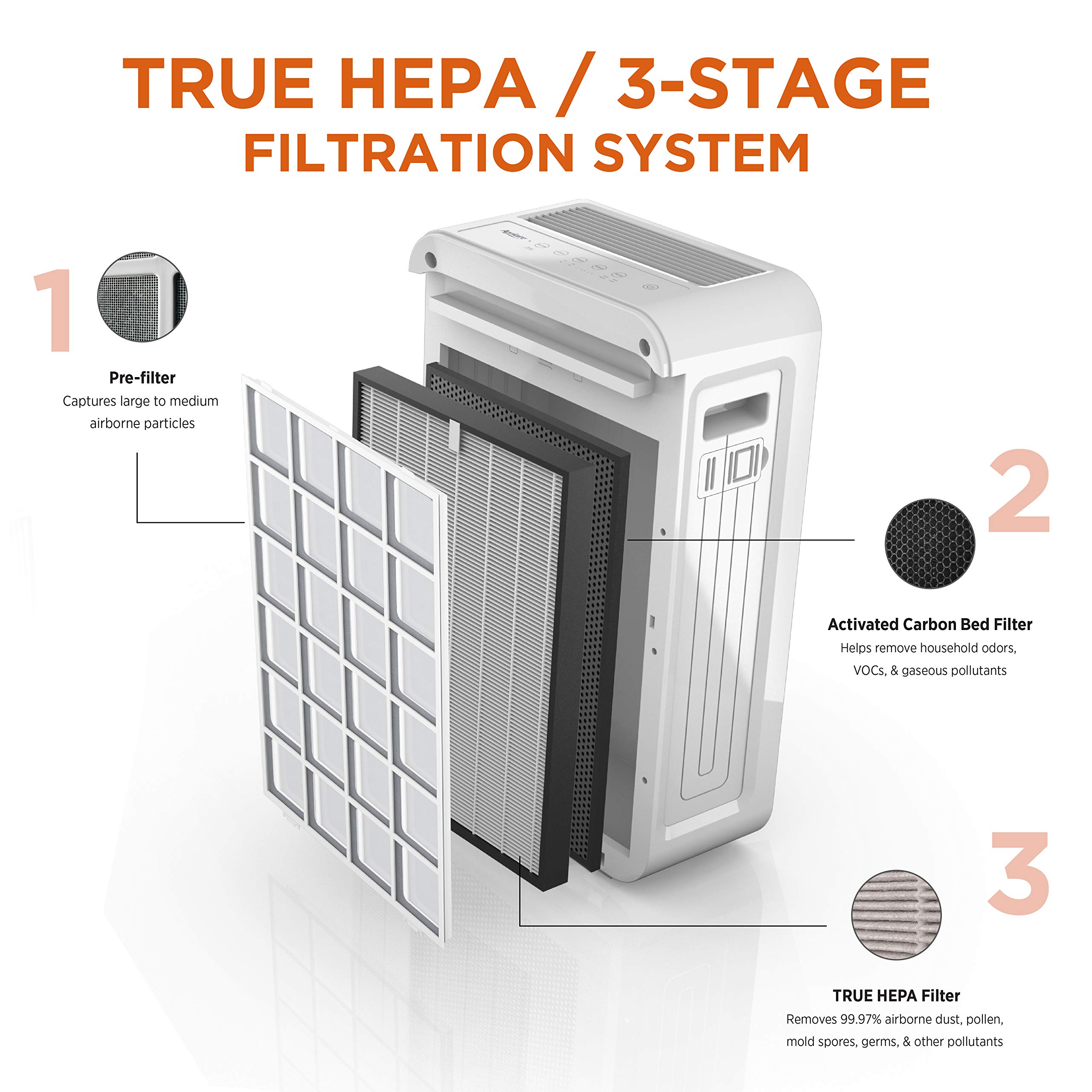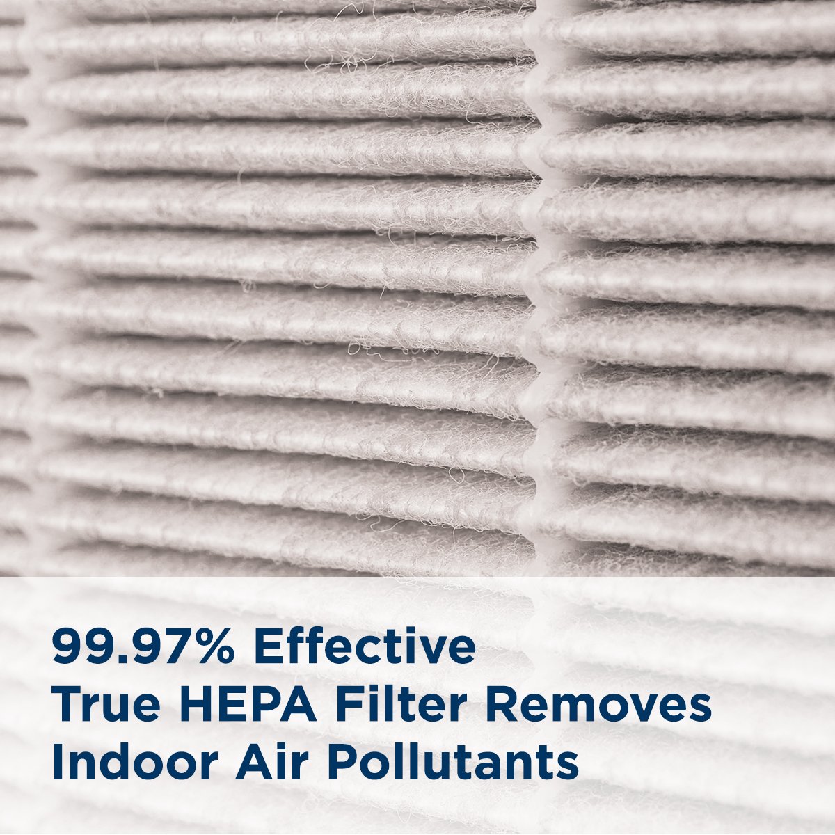 CAPTURES UP TO 99.97% OF AIRBORNE ALLERGENS and particles 0.3 microns and larger passing through the True HEPA filter, including bacteria, pet dander, pollen, mold spores, and other airborne impurities