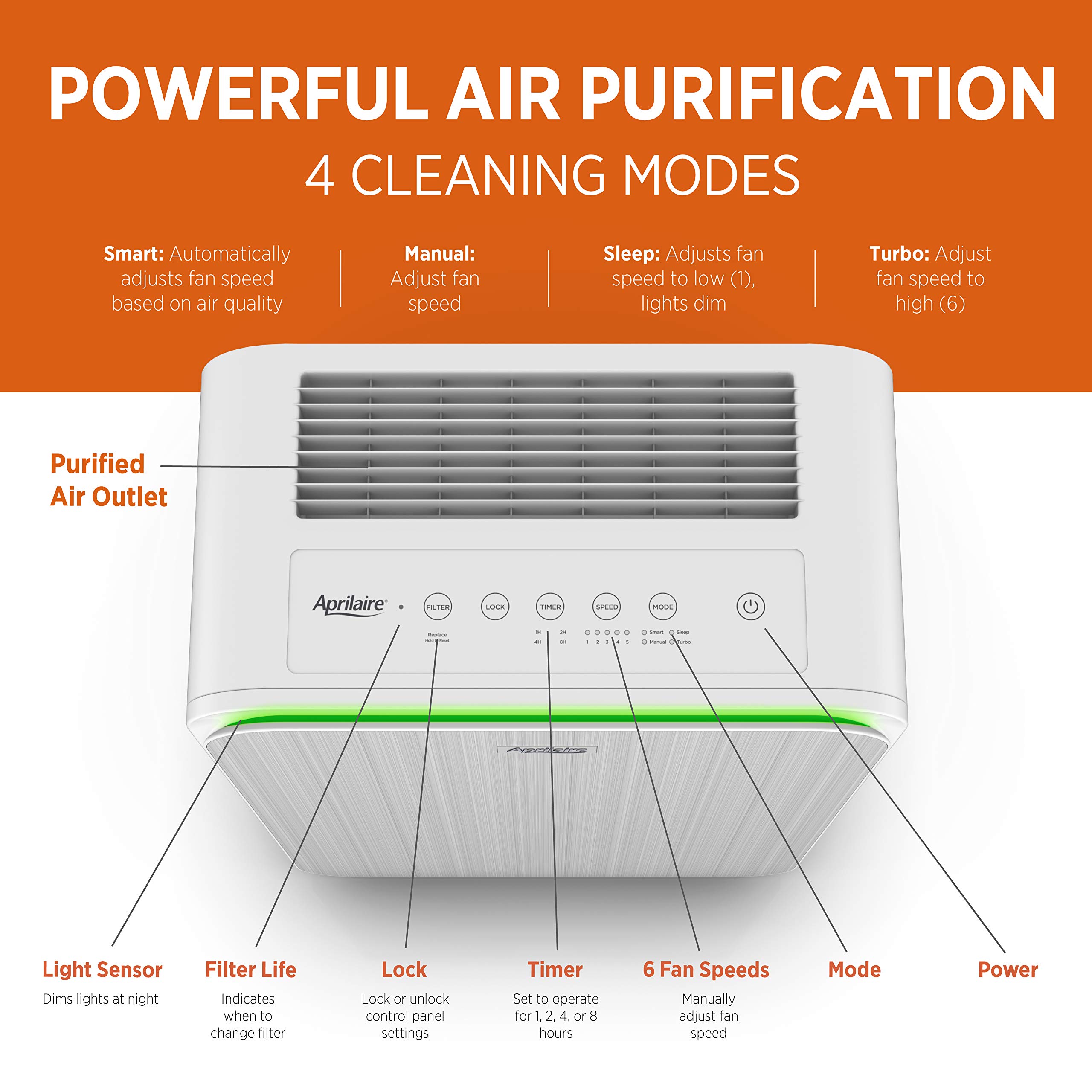 For allergy sufferers, the air both outside and inside your home can be an unpredictable obstacle course filled with allergy and asthma triggers. Airborne allergens are blamed for unpleasant symptoms including sneezing, itchy or watery eyes, and runny nose. The Allergy 9550's 3-stage advanced filtration system captures up to 99.97% of airborne allergens 0.3 microns and larger passing through the True HEPA filter - including pollen, mold spores, and other impurities. It also features an Alumina Oxide & Activated Carbon Bed Filter to reduce allergy triggers, odors and VOCs. It has 6 fan speeds to handle varying levels of allergens encountered throughout the year. Let Smart Mode do all the work for you, automatically detecting airborne particulates and adjusting the level of air purification accordingly. With the Aprilaire 9550, you can purify the air in your bedroom, living room, or other medium to large rooms up to 495 square feet. Its sturdy design and convenient side handles make it easy to move from room to room so you can enjoy fresh, breathable air in any room in your home. Perhaps best of all, the Aprilaire Allergy 9550 purifies the air without the use of an ionizer, so there's no harmful ozone greenhouse gas created inside your home. Live life uninterrupted, pure and simple.