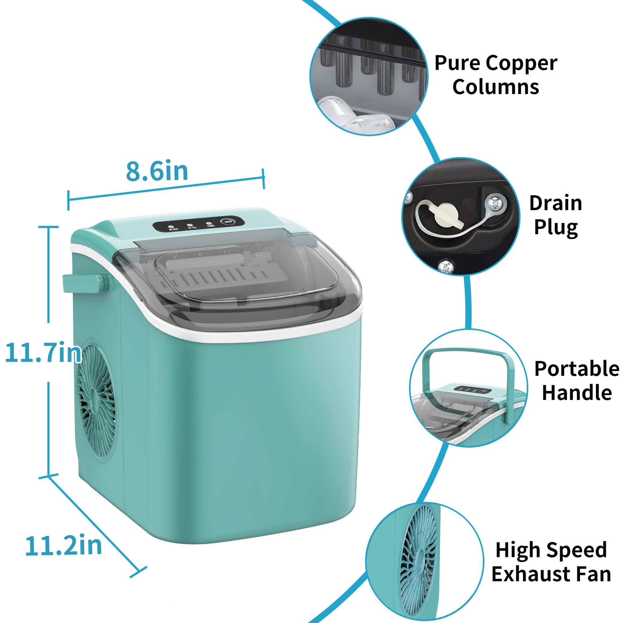 【PORTABLE ICE MAKER】Our compact ice maker comes with a carrying handle and weighs only 14.74 lbs. Easy to carry and operate, you can mention it yourself anywhere you want to go. It has a wide range of applications, whenever and wherever you are, ice is there.You can use it for bar, tea shop, KTV, kitchen and office. Size: 12.3(D)*9.88(W)*12.6(H) inch.