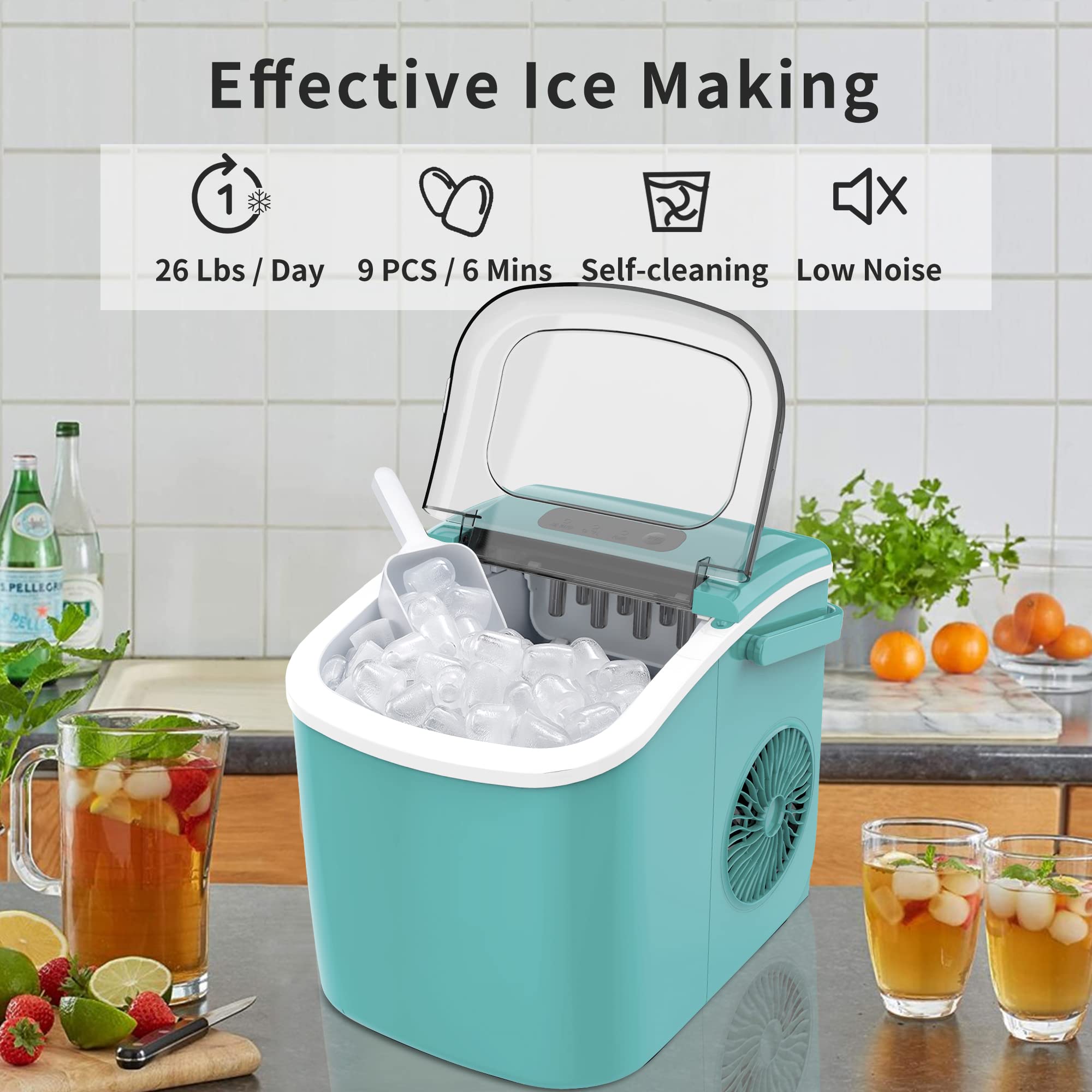 【FAST ICE MAKING】 The ice maker can make 9 bullet-shaped ice cubes in as little as 6 minutes.Fill 1.2L of water into the water tank, maximum ice capacity can reach 26 pounds in 24 hours.With this low-noise countertop ice maker, you can get fresh ice quickly at any time.