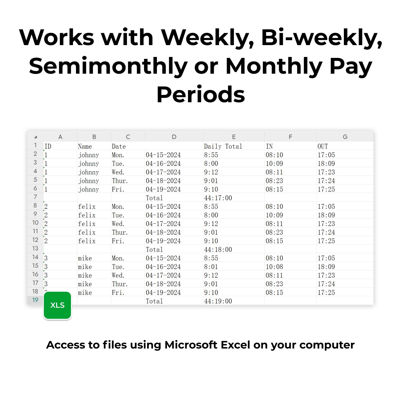 ENSURES ACCURATE PAYROLL: Automatically detects employee attendance. Seamlessly move data from the time clock to your computer using a USB flash drive, view files with Microsoft Excel on your computer, and accommodate weekly, bi-weekly, semi-monthly, or monthly payroll cycles to suit your business requirements