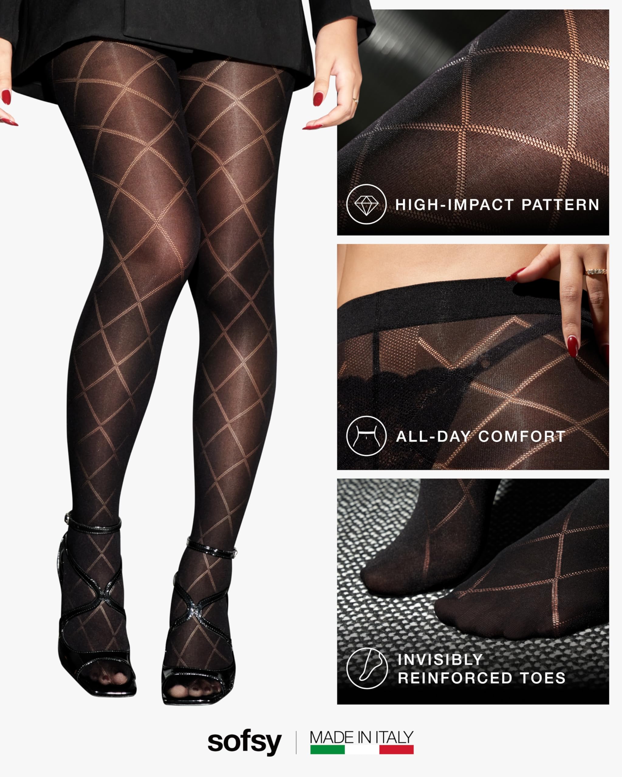 Description Elevate your style with sofsy’s Italian-Made Patterned Tights — where timeless elegance meets everyday versatility, backed by customer-loved comfort and lasting quality. Designed for women who value both beauty and function, our collection includes lace tights, floral tights, diamond patterned tights, and patterned fishnet stockings for women, each crafted in Italy with over a decade of hosiery expertise. Every pair is made from premium, OEKO-TEX certified nylon–elastane blends for a buttery-soft, breathable feel and true-to-size fit that stretches comfortably without digging or rolling. The all-day stay-up high waistband smooths and flatters, while reinforced toes and quality knitting deliver durable, rip-resistant wear that holds up through dancing, layering, and everyday movement. Choose from delicate floral lace tights, bold fishnet patterns, chic diamond designs, or opaque tights with designs — each one finished with intricate patterns exactly as pictured. Whether it’s lace stockings for women sexy enough for date nights, rose tights for a romantic touch, or black tights with designs for sophisticated workwear, sofsy patterned tights adapt seamlessly to every wardrobe moment. Perfect for office wear, party outfits, costumes, and casual styling, these tights pair effortlessly with dresses, skirts, or shorts. With luxurious Italian craftsmanship, inclusive sizing from XS to Large, and versatile patterns, they’re more than an accessory — they’re a style investment you’ll reach for season after season.