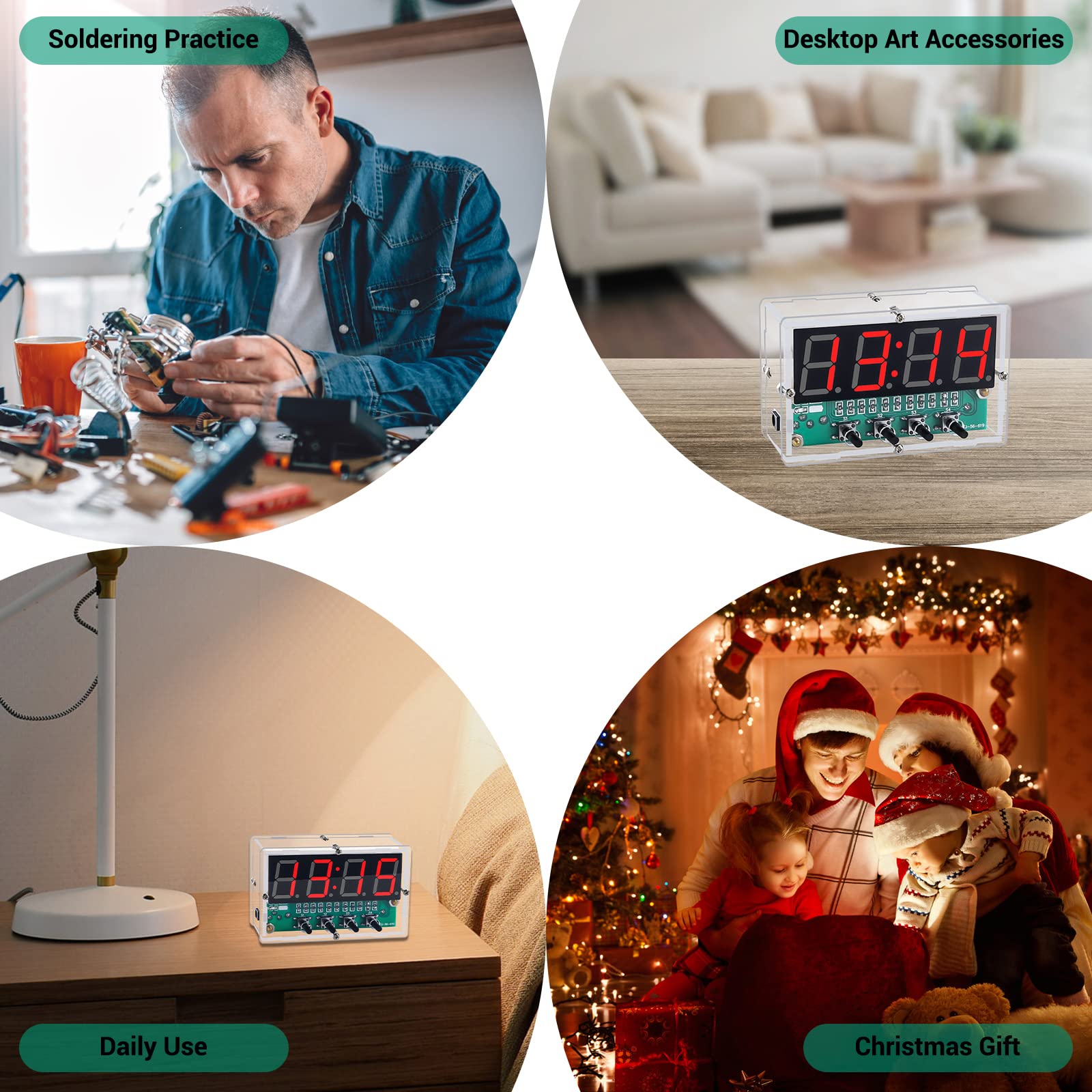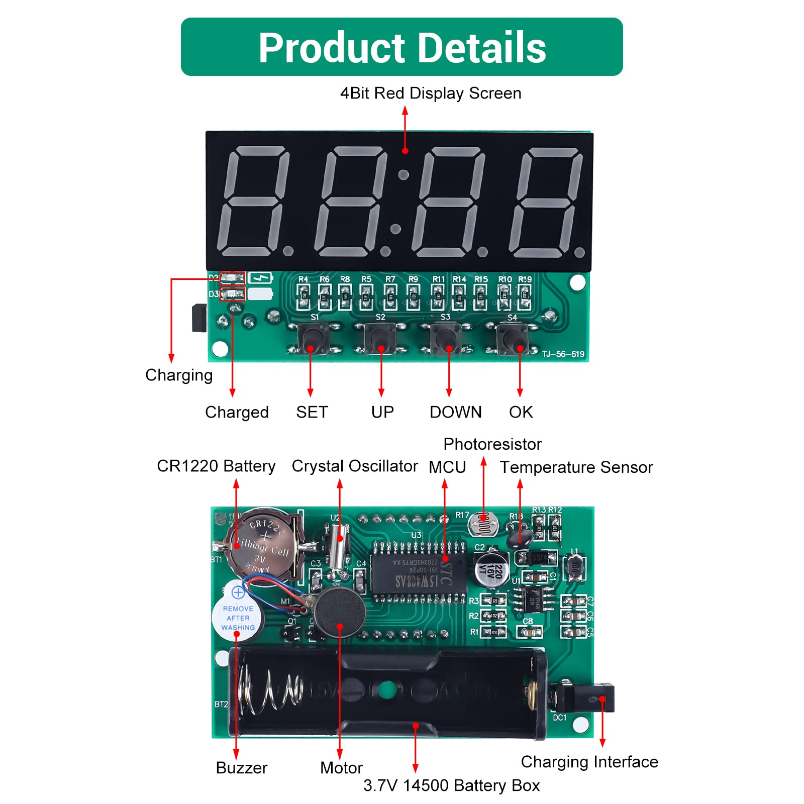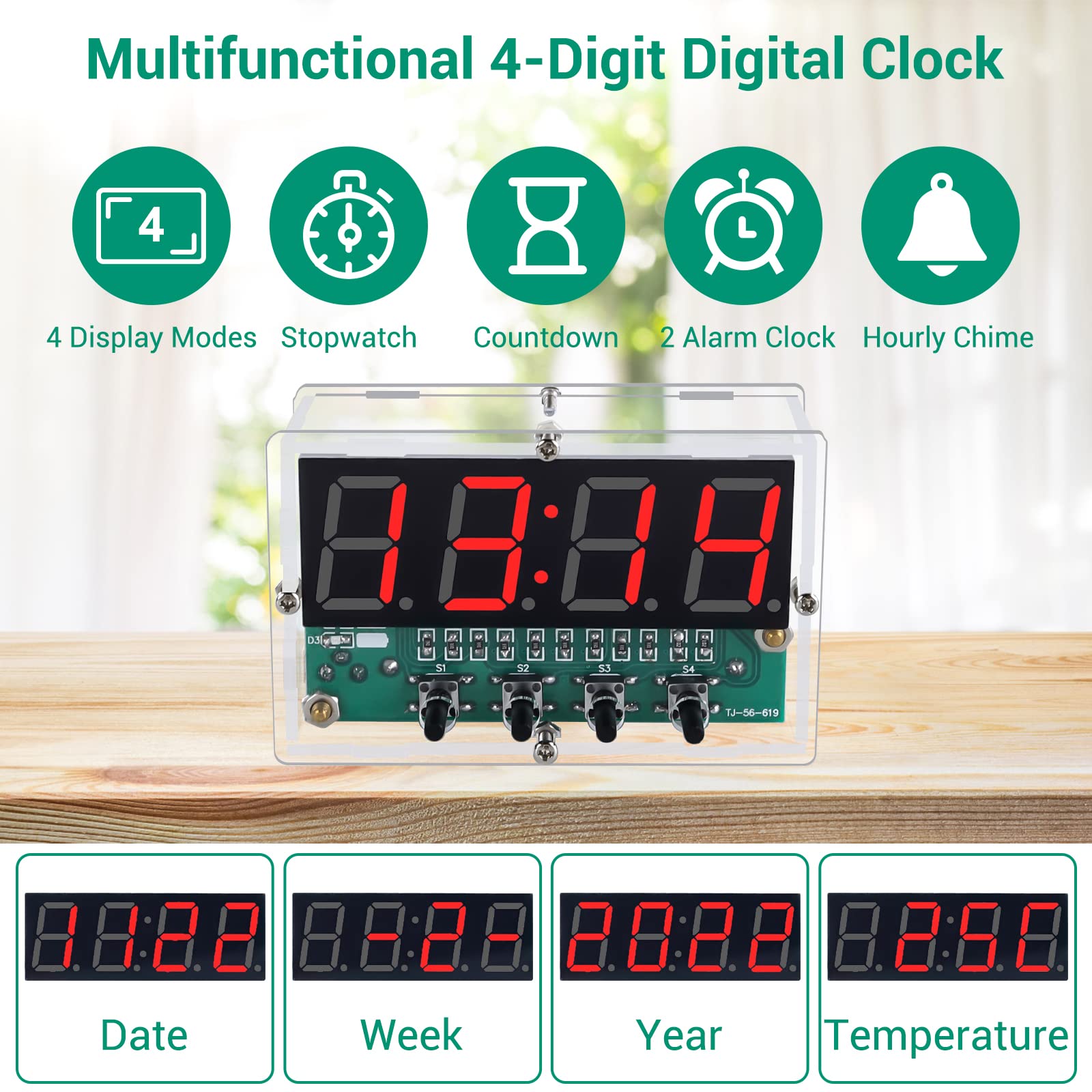 ⏰【Light-controlled Temperature Clock Kit】The practical soldering kit are used to installed to a 4-Digit Rechargeable Digital LED Electronic Clock with Acrylic Shell. Which can display current date, time(24 hour), week, temperature in the real time, also has stopwatch and countdown mode. Highly recommended to practice soldering skills enjoyably for you. Assemble an unique diy kit for anyone you love, accompany them every moment.