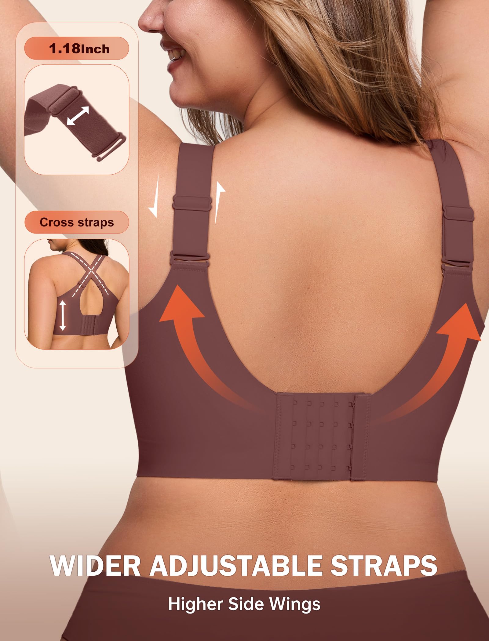 【Back Smoothing Bras & Wider Hooks】The back features precision glue-point technology for superior comfort, with a contoured wave-shaped inner layer that hugs your curves flawlessly. This sleek design not only enhances aesthetics but also smooths and conceals back bulges for a perfectly streamlined silhouette. The bras for women no underwire features 5 rows of 4 buckles and a free extender for a customizable fit.