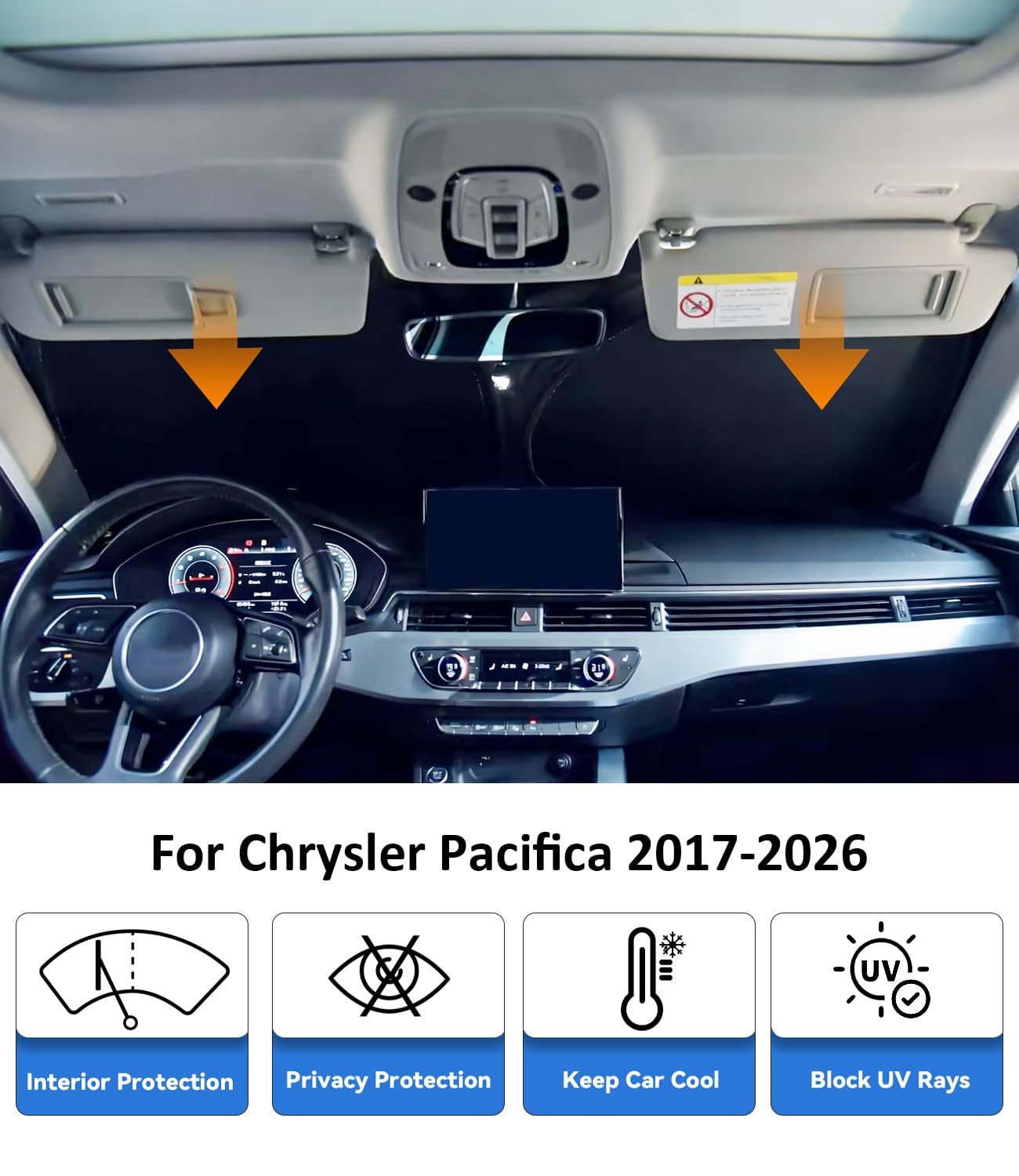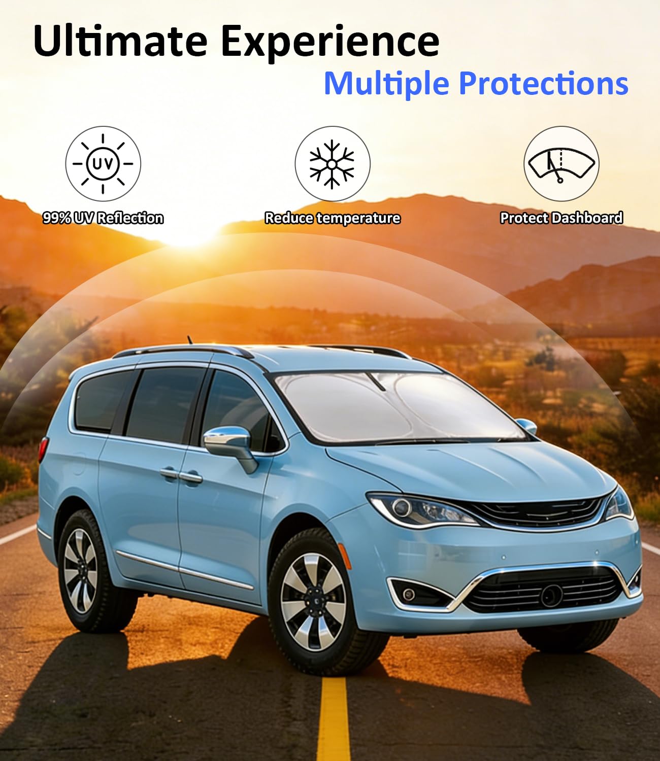 [Custom Precision Fit for Your Pacifica] Engineered specifically for the Pacifica (2017-2026 models), this sun shade installs effortlessly. It hugs your windshield perfectly with no suction cups needed, and resists sagging or collapsing—making it ideal for both daily use and outdoor camping.