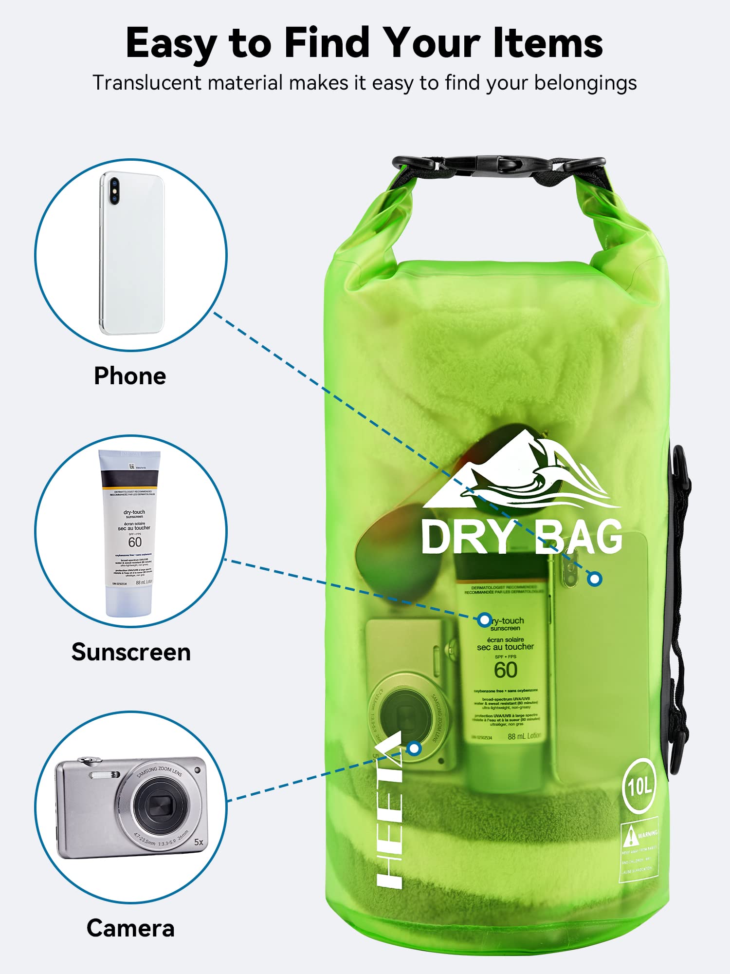 Visible - Transparent dry bag with 11 colors, easy to spot your clothes, towel, water bottle, phone, laptop and wallet. Quickly find what you items without digging. You can even read messages on your phone or pad through the bag