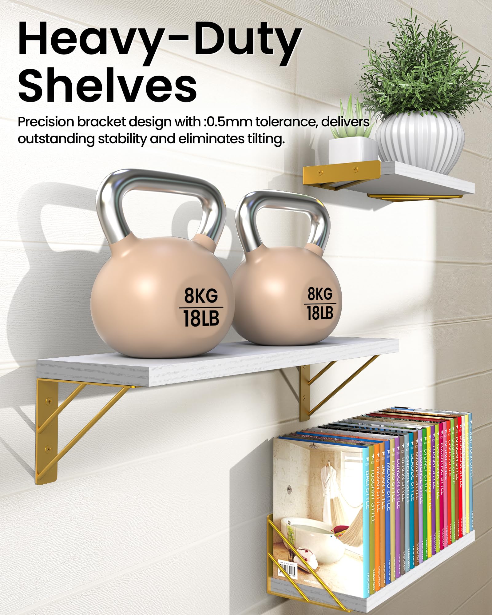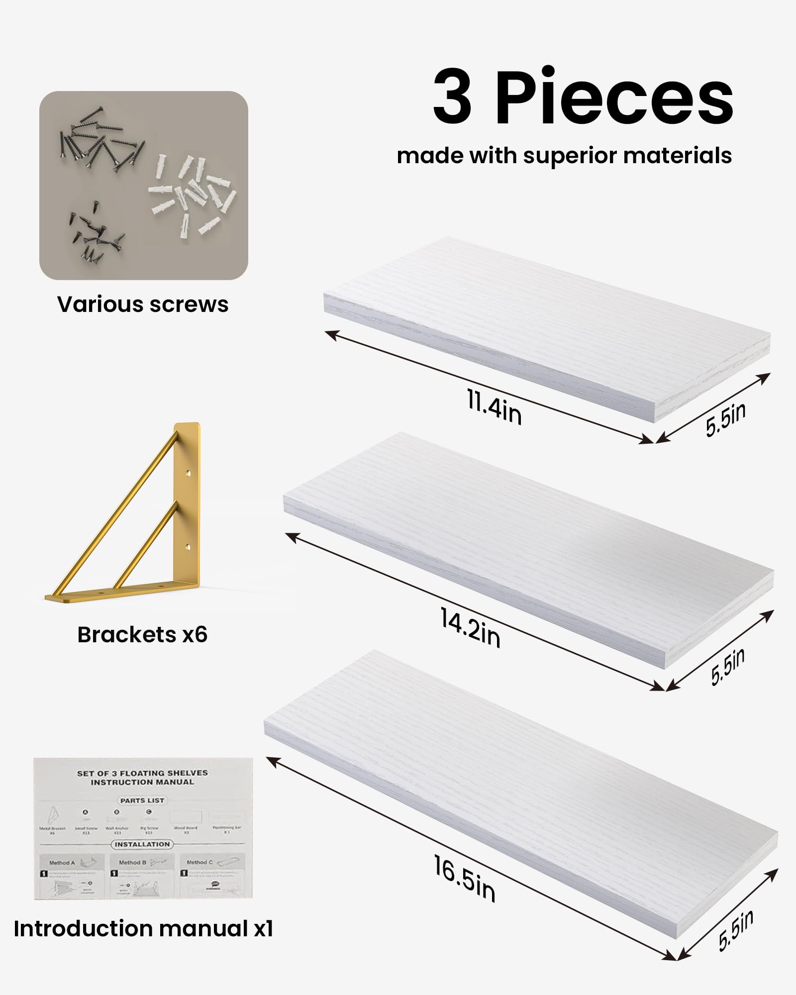 【Sturdier and Easy to Install: Large】16.5 × 5.5 × 4.6 inches; Medium: 14.2 × 5.5 × 4.6 inches; Small: 11.4 × 5.5 × 4.6 inches. These floating shelves are wider and sturdier than others to safely hold collectibles, photos, small plants and showcase favorite dishes or build your own coffee bar. Easy to assemble with all necessary hardware included according to the instruction steps.