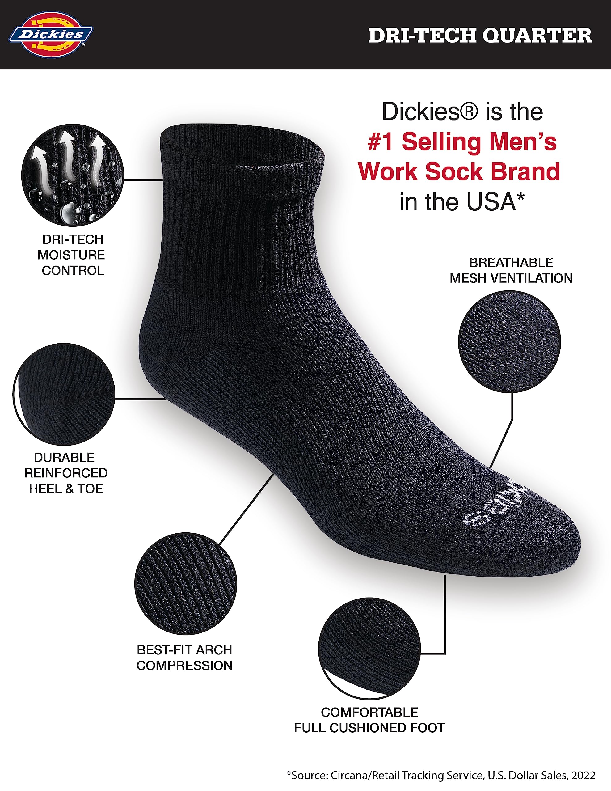 Description Dickies Men's Dri-tech Moisture Control Quarter Socks Multipack with wicking, moisture management fibers keeps feet dry, ventilation channels engineered for air circulation and moisture control, arch compression hugs feet and keeps socks in place, while providing in-step support, Reciprocated heel and toe for superior fit and full cushion comfort. For Over 95 Years Dickies has been making hard-duty work products built to stand up to whatever life throws at you. Dickies Work Socks are built with purpose to deliver superior comfort and performance on and off the job.