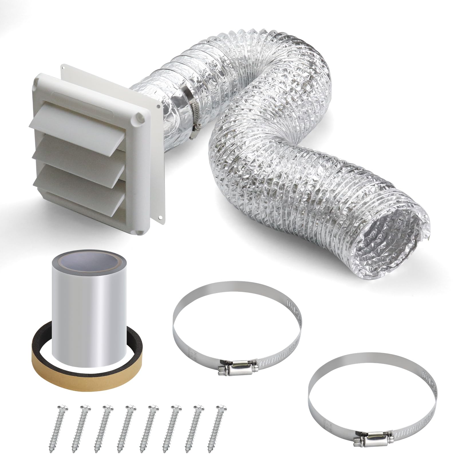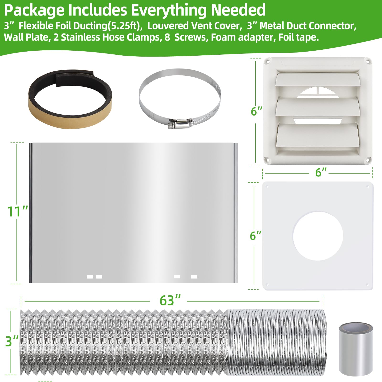 Package includes: Our package includes everything needed to replace the exhaust fan's ducting---- 3” flexible dryer vent hose(Max 63”), 6" x 6" white louvered vent cover, 11” long 3” diameter metal duct connector, dryer vent wall plate, 2 stainless steel hose clamp, foam adapter, 8 mounting screws, foil tape.