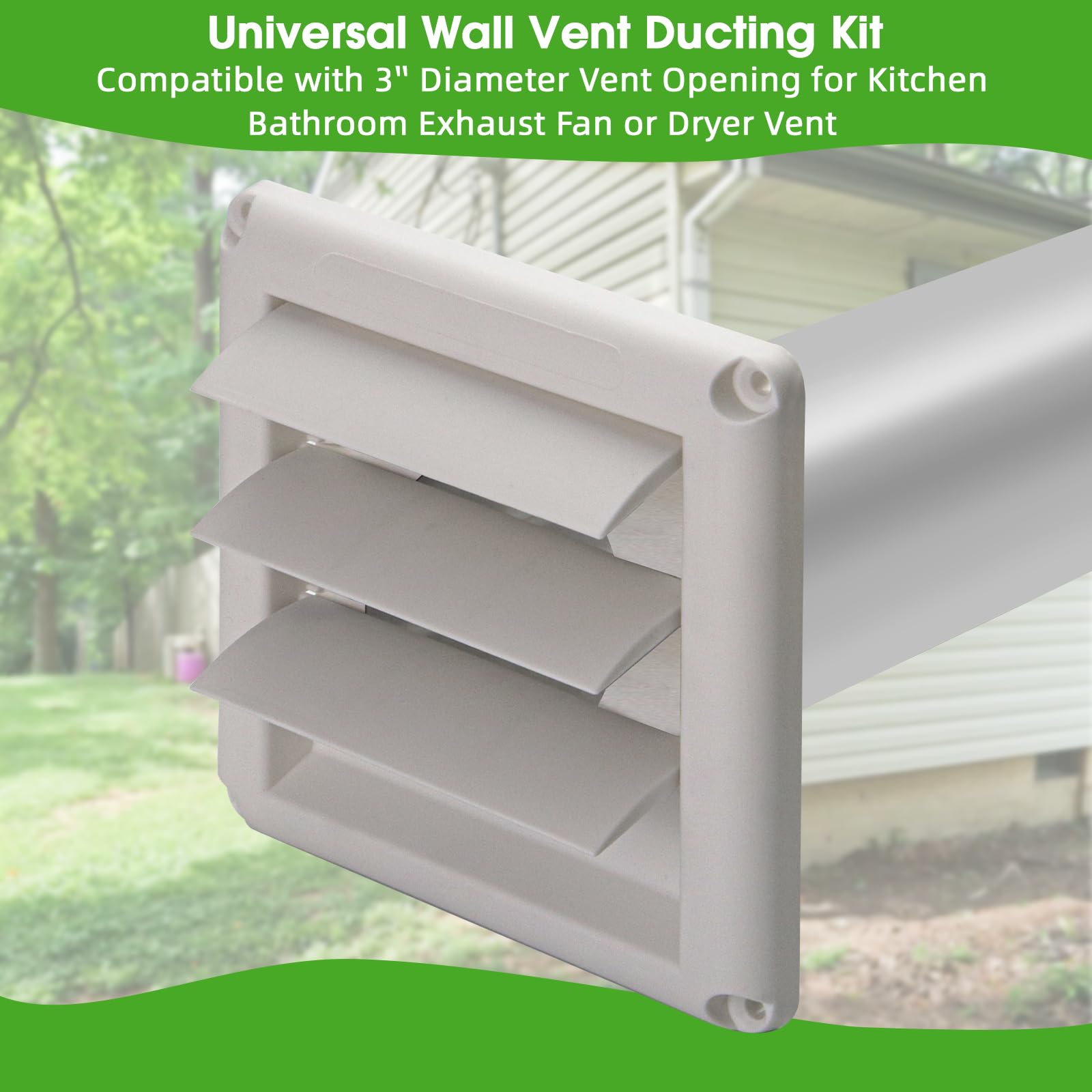 Universal 3inch dryer vent kit : The 3” Flexible Dryer Vent Wall Ducting Kit compatible with Broan-Nutone Ventilation Fan, and other universal 3” diameter vent opening, easy installation with foam adapter. Louvered vent cover with ease for maximum exhaust flow to exhaust hot air from the clothes dryer vent and bathroom fan venting. PLS measure duct diameter to ensure the size is right before purchasing.