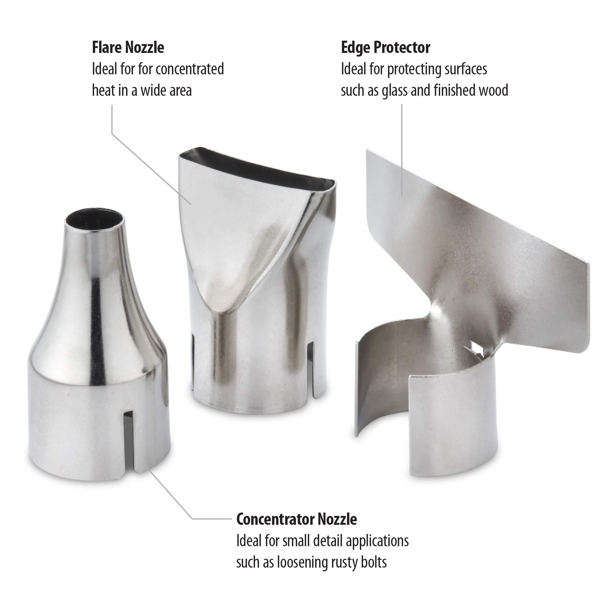 INCLUDES THREE NOZZLES ATTACHMENTS: The kit includes an edge protector nozzle for directing heat away from delicate surfaces. The flare nozzle distributes heat across a long, narrow area. The concentrator nozzle outputs heat in a small, focused area