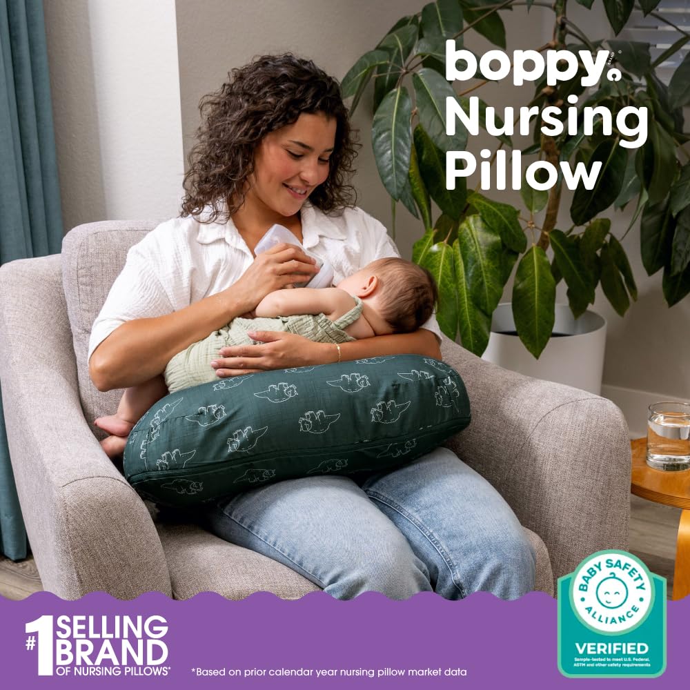 The flagship Boppy Nursing Pillow is designed to make feeding time more comfortable, supportive, and stress-free for both you and your baby. Its firm, ergonomic, patented design offers a higher surface to bring baby closer, reducing back, neck, and shoulder strain of parents during bottle or breastfeeding. The spacious, supportive surface helps position baby at the right height for a better latch in multiple feeding positions. Filled with hypoallergenic recycled fiber, it maintains its supportive shape over your entire feeding journey. A water-repellant liner and machine-wash, dryer-safe cover make cleanup easy, because spit happens! Trusted by parents and baby experts for over 35 years and verified by the Baby Safety Alliance, Boppy helped develop rigorous federal safety guidelines for nursing pillows, putting baby safety and parent comfort first, and ensuring comfort and confidence with every mealtime moment.