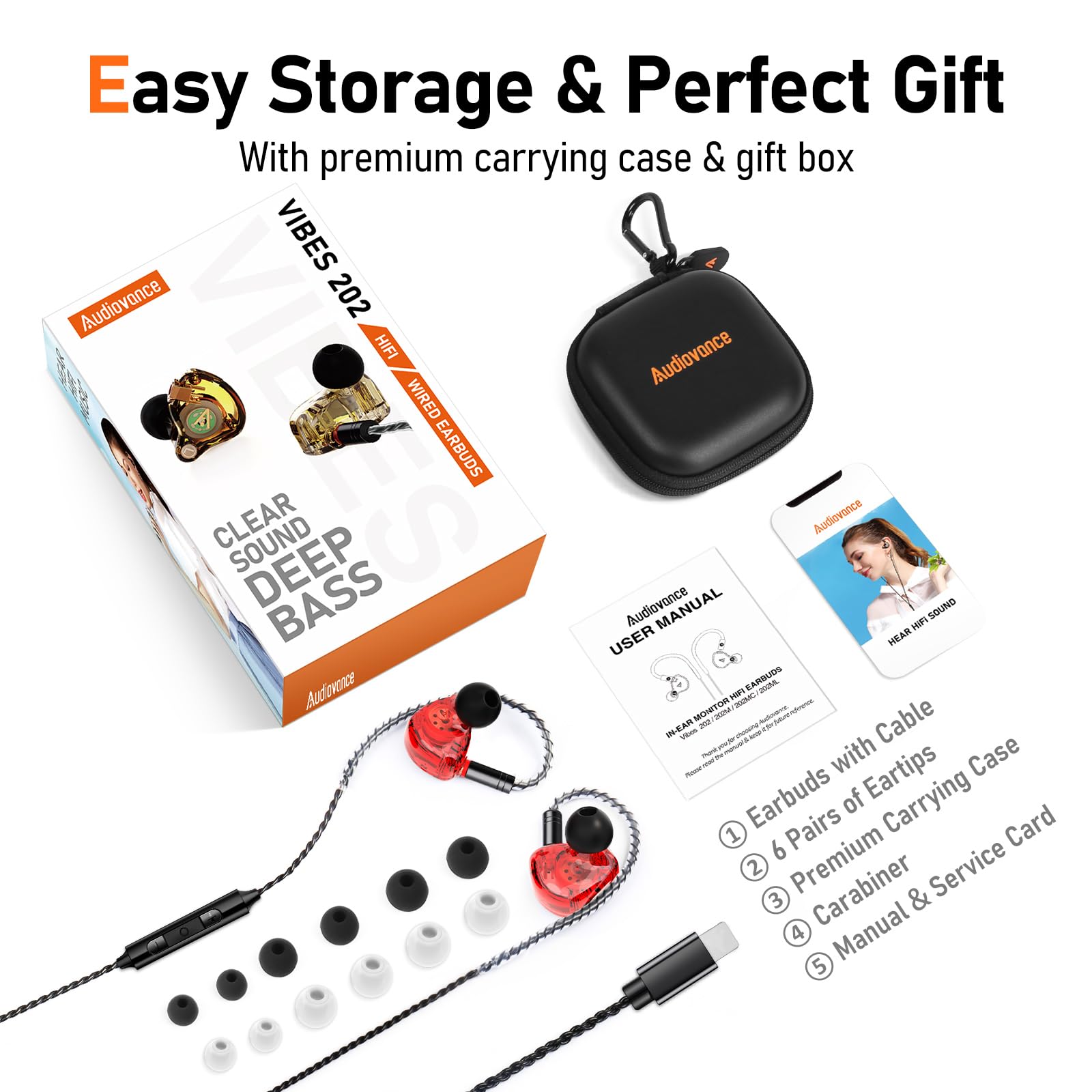 What's in the Box: Vibes 202ML HiFi wired earbuds with silver-plated cable, 6 pairs of eartips, carrying case, carabiner & user manual.