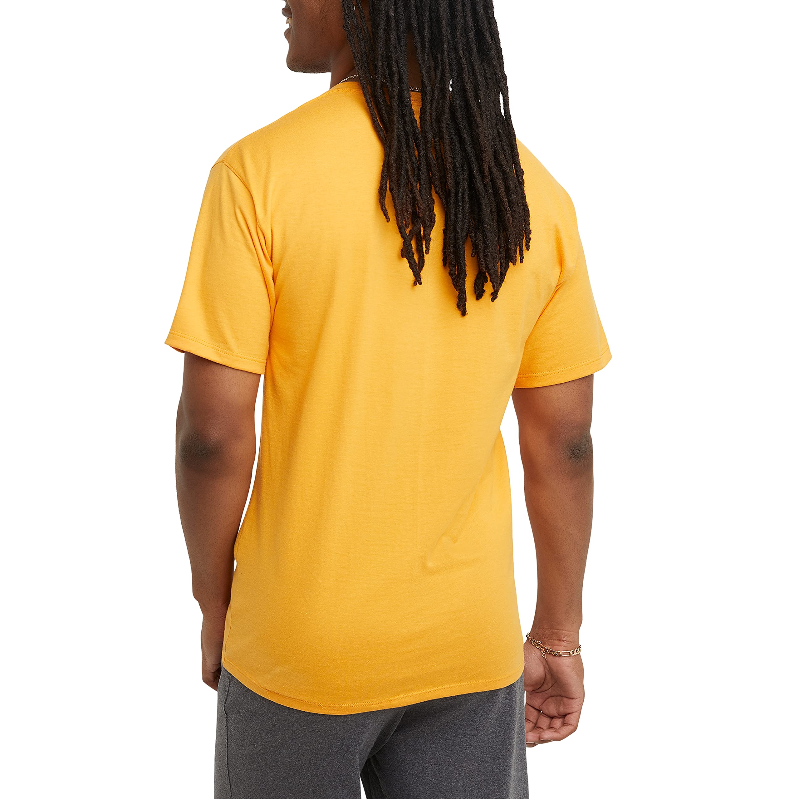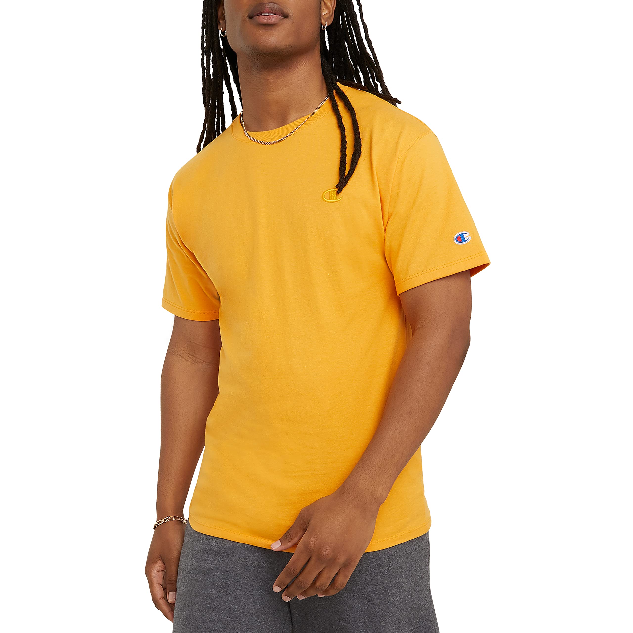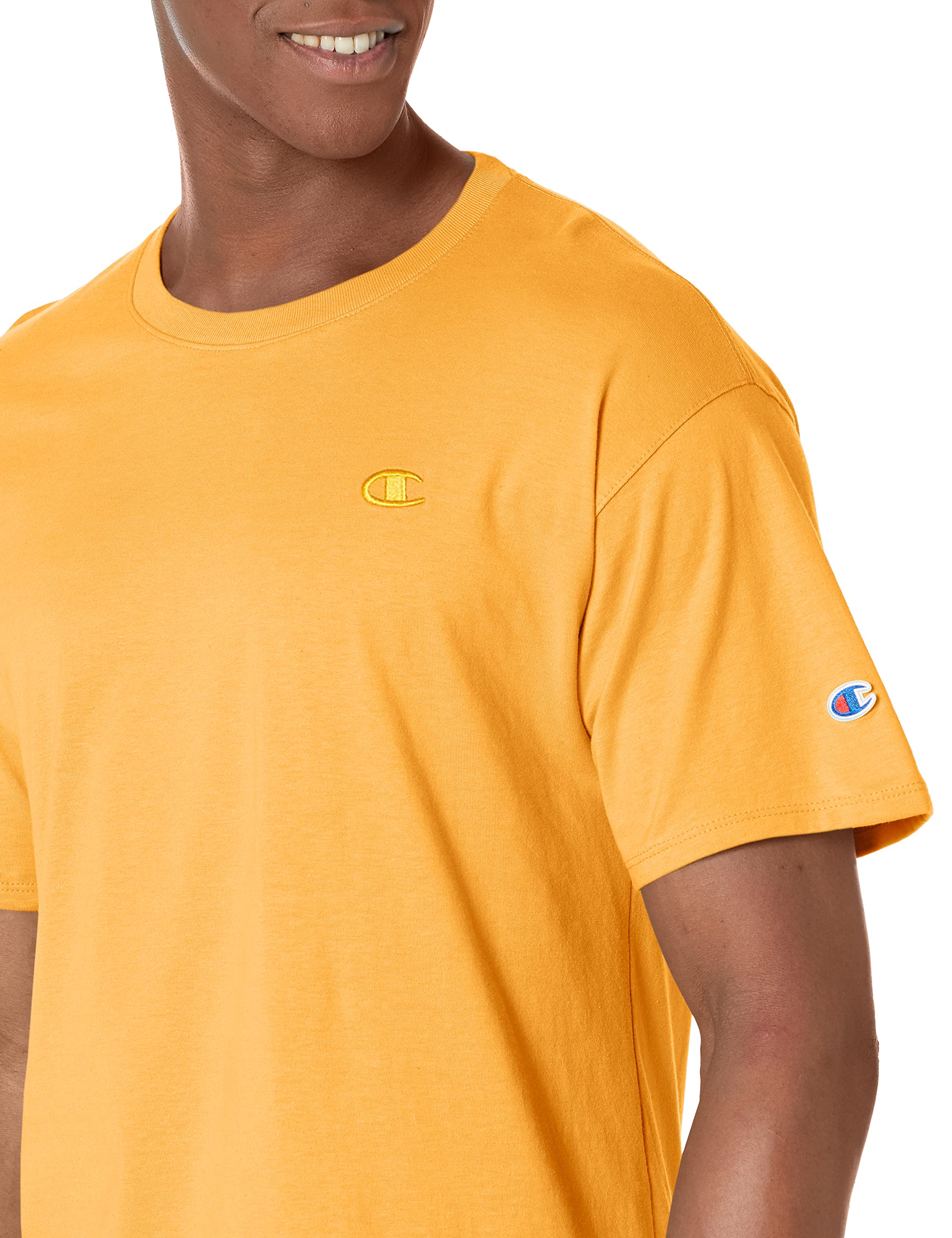 Description TIMELESS THREADS. Add lived-in comfort to your daily rotation with this T-shirt for men, expertly crafted from a soft cotton or cotton blend. Cut for a standard fit, it's detailed with a shape-holding ribbed crewneck, short sleeves, and matching back neck tape for no-irritation comfort. This classic men's T-shirt style is a must-have that pairs well with sweats and shorts for a rounded-out sporty look. Finished with the iconic C logo patch embroidered at the chest for an authentic look.