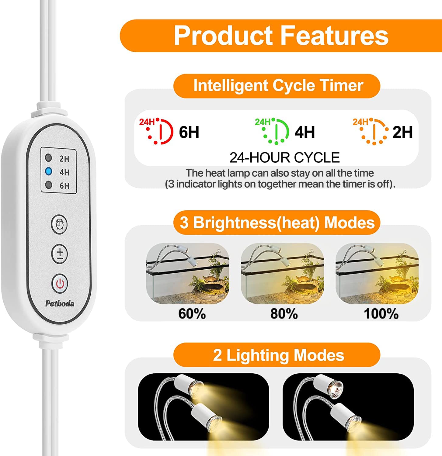 【Larger Basking Area & Adjustable Temperature】Our double-headed reptile heat lamp expands the lighting area to provide more simulated sunlight, which is very helpful in promoting reptiles' appetite and calcium absorption. With 3 brightness (heat) settings, you can adjust the warmth to suit your pet's needs by pressing the +/- button.